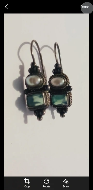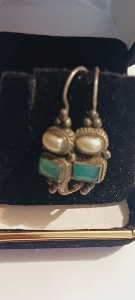 1000+Sterling Silver 925 Freshwater Pearl & Green Chalcedony Stones Drop Earrings. These are a pair of vintage drop earrings featuring Freshwater pearl and green chalcedony stones. They have a unique, antique look and would make a great addition to any jewelry collection! 1" long. Excellent condition. ALL MY PRICES ARE NEGOTIABLE !!