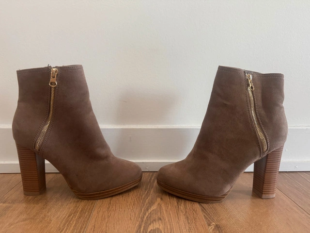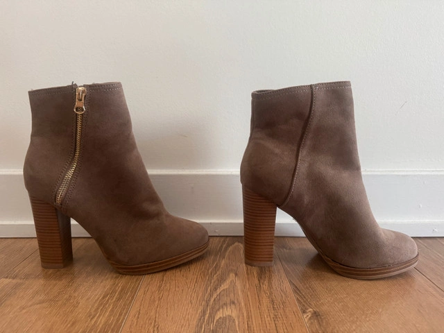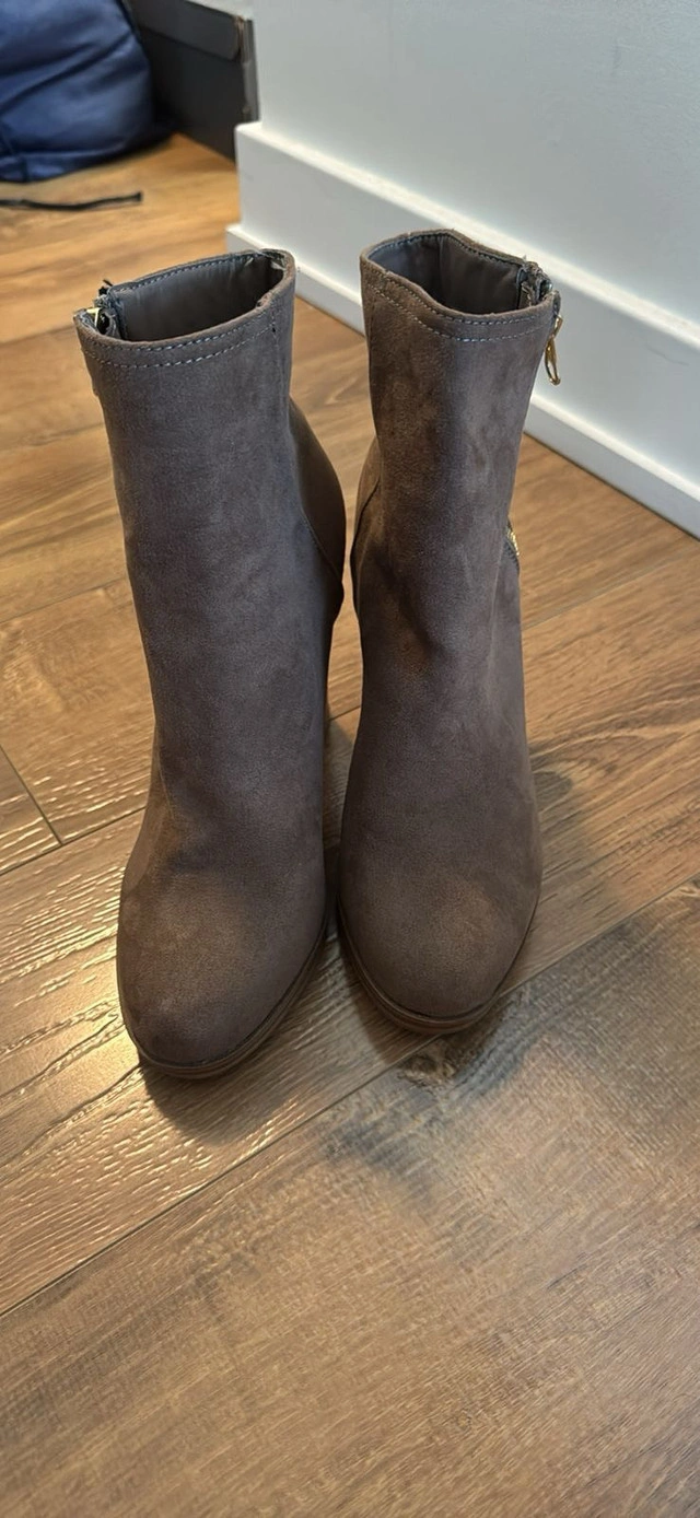 21These stylish brown heeled boots are perfect for adding a touch of elegance to any outfit. They are barely used and very good condition. The suede boots feature a comfortable block heel and a side zipper for easy on and off. Selling as it does not fit my wife well. Perfect for Fall & Winter Additional Details: - Colour: Brown - Heel Height: Approximately 3 inches - Closure: Side zipper - Style: Ankle Boots - Size : US 7 Pickup: Toronto Public Library, Agincourt If the ad is up, the boots are available!