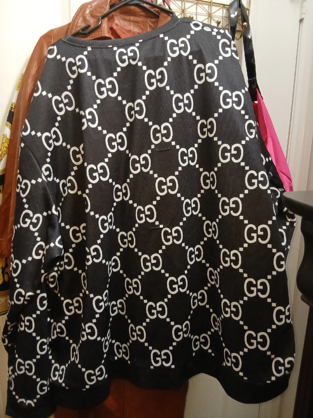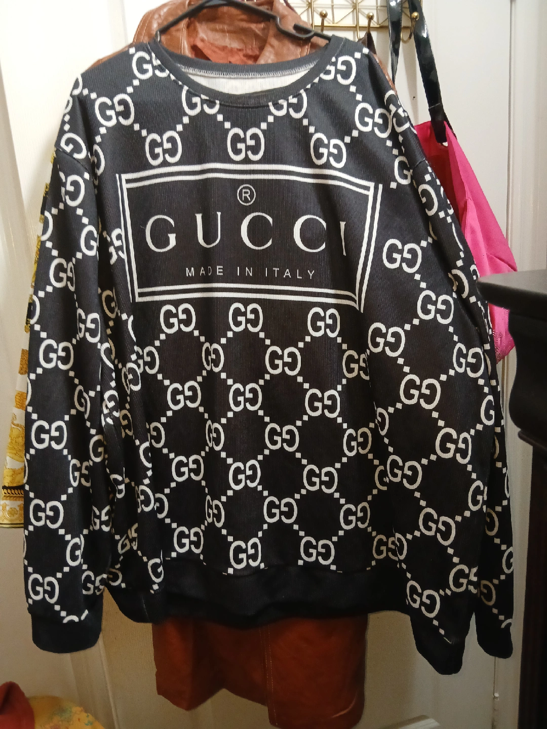 25Selling a Gucci sweatshirt with a black and white pattern. It says "Made in Italy" on the front. The material feels soft and comfortable. Perfect for a casual and stylish look!