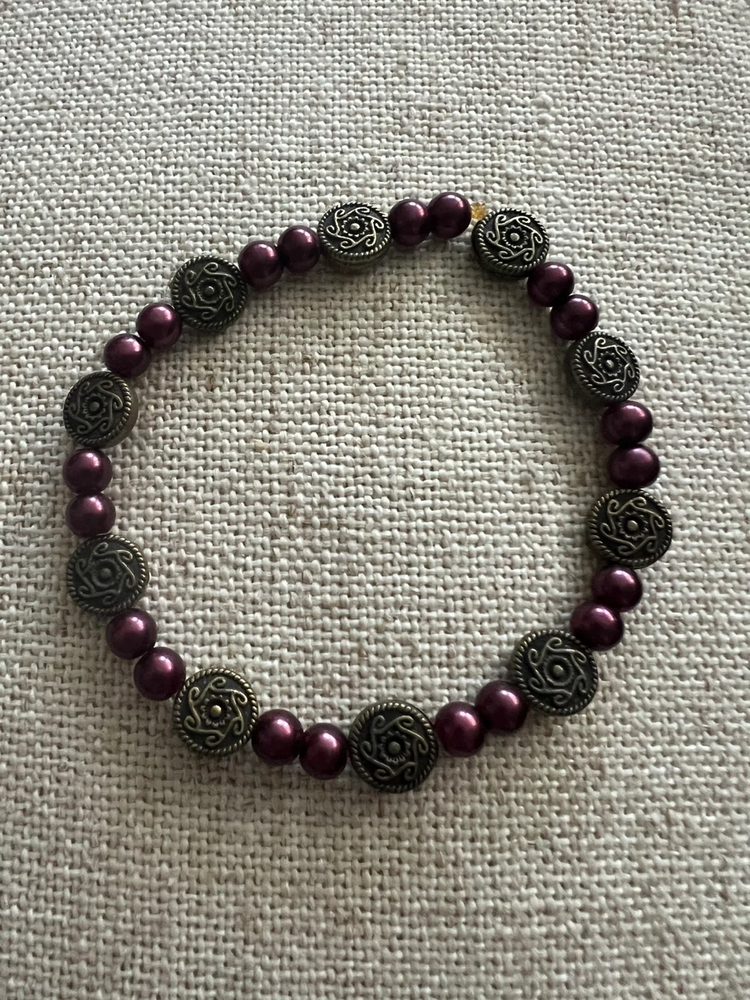 257Beaded stretch bracelet with bronze colored decorative accents! Stretchy & best for a larger wrist.