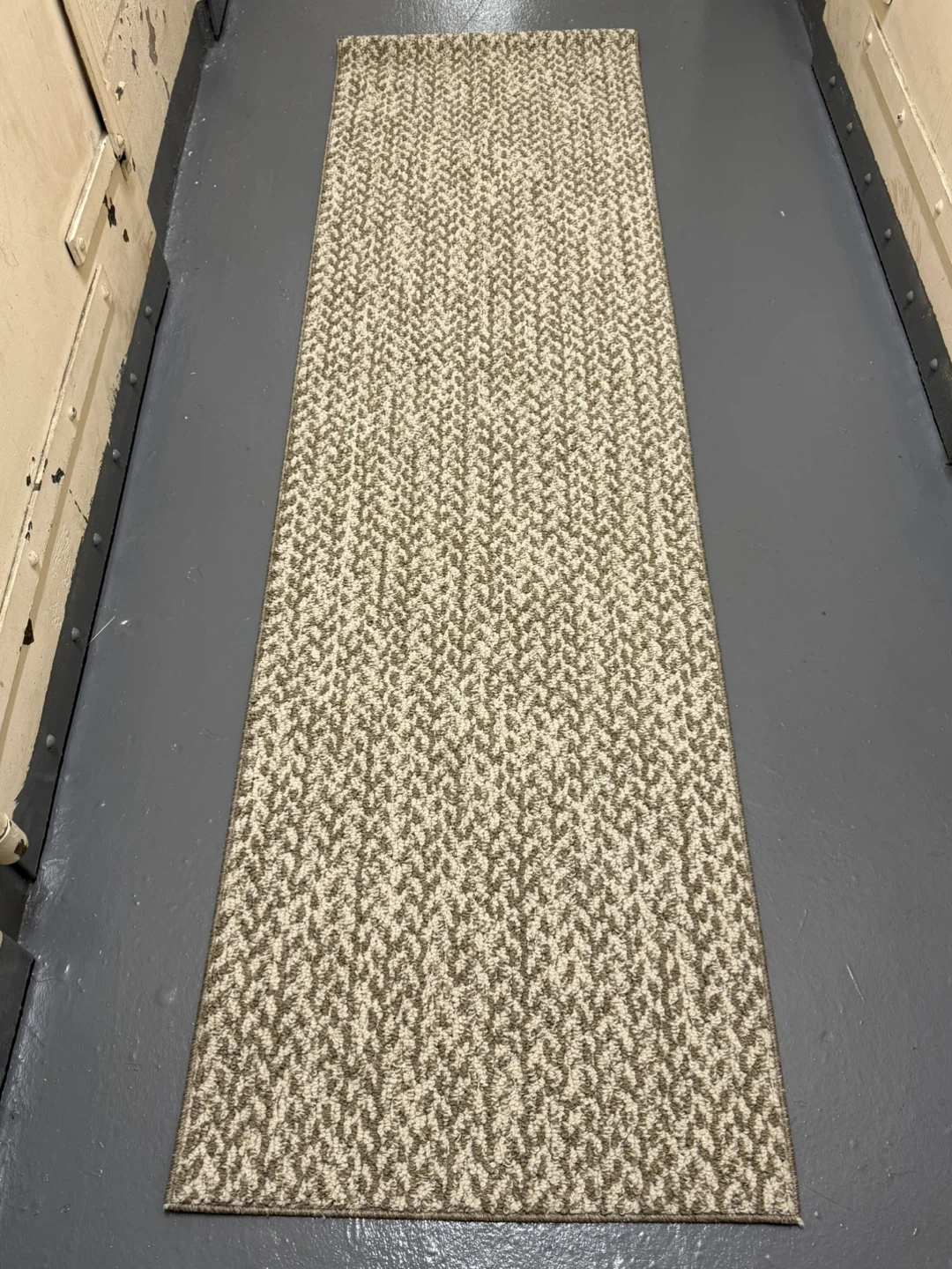 105Here's a tufted herringbone patterned runner rug in great condition! It’s perfect for hallways or entryways. The rug has a neutral color palette that can easily match most decor styles