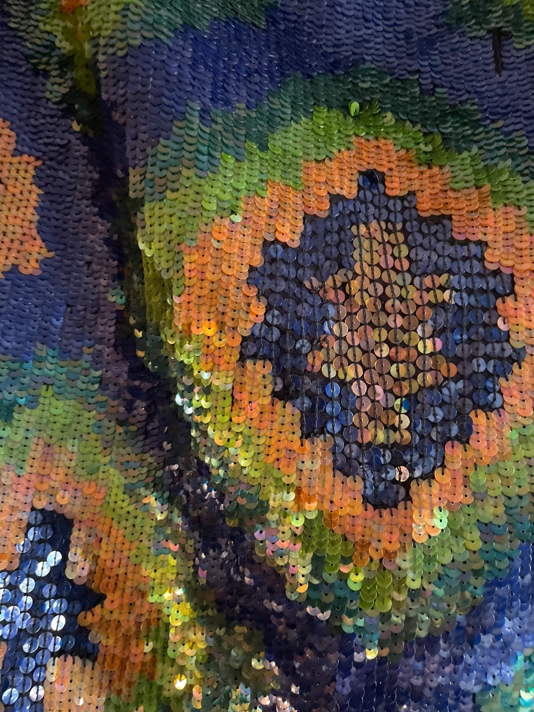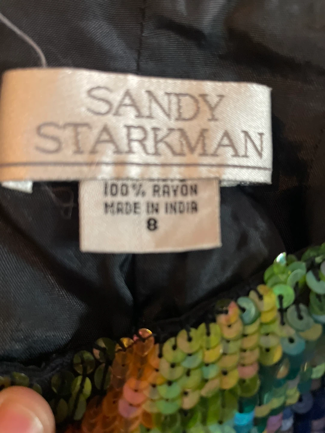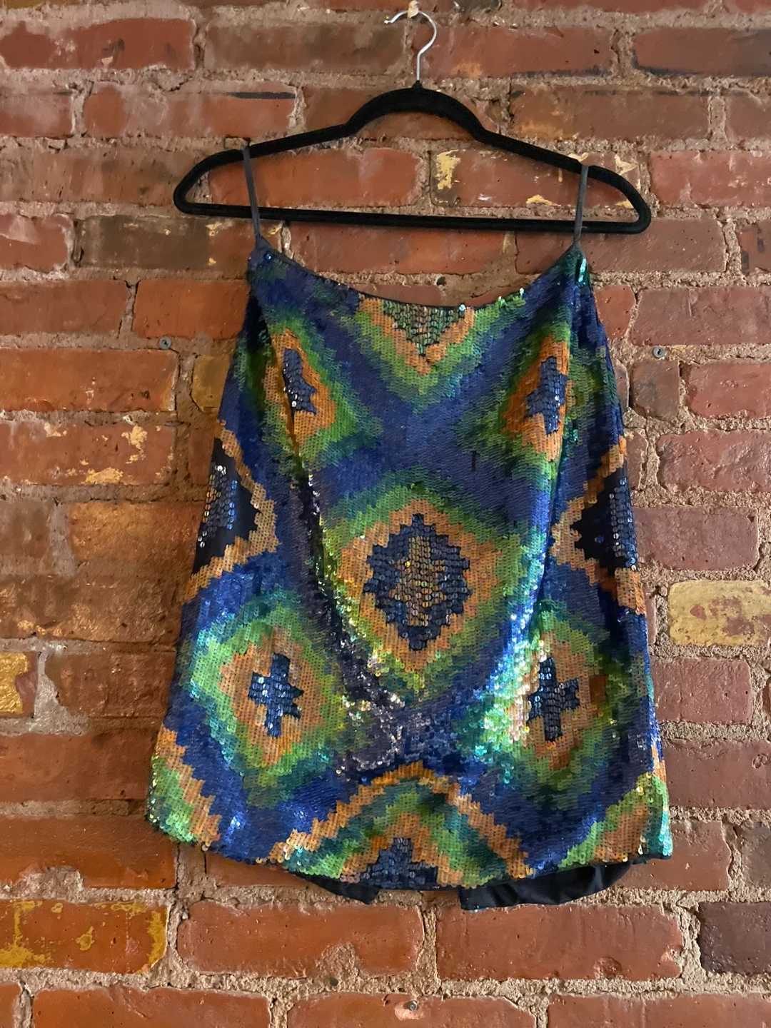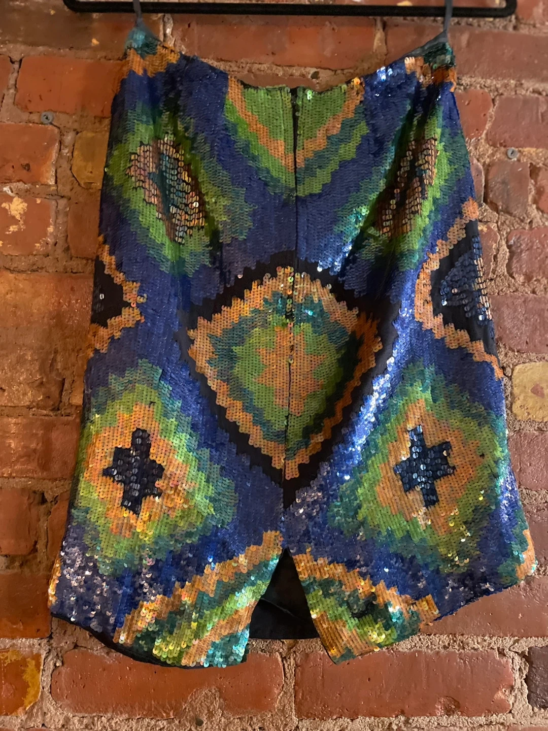 82Selling a fun and sparkly sequin skirt from 1990s Sandy Starkman! It says a size 8 but vintage runs a bit smaller closer to a 6 and made of 100% rayon. The skirt features a unique sequin pattern with blue, green, and coral orange colors. Perfect for adding some flair to your wardrobe. The design is so modern!