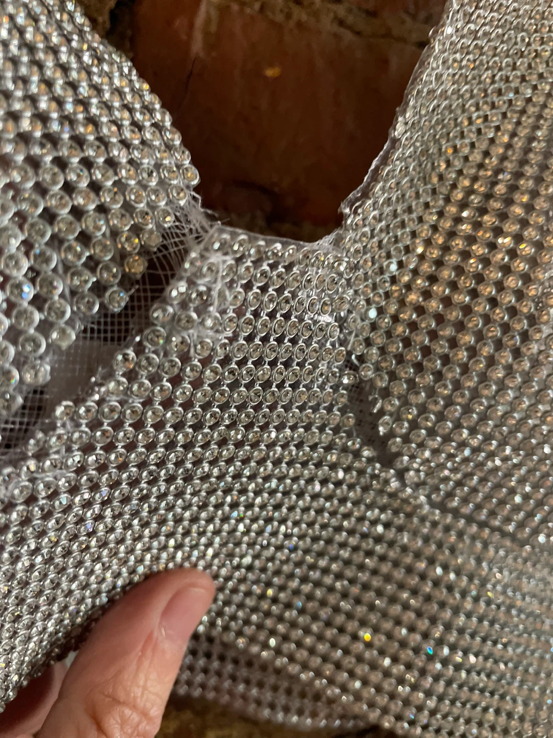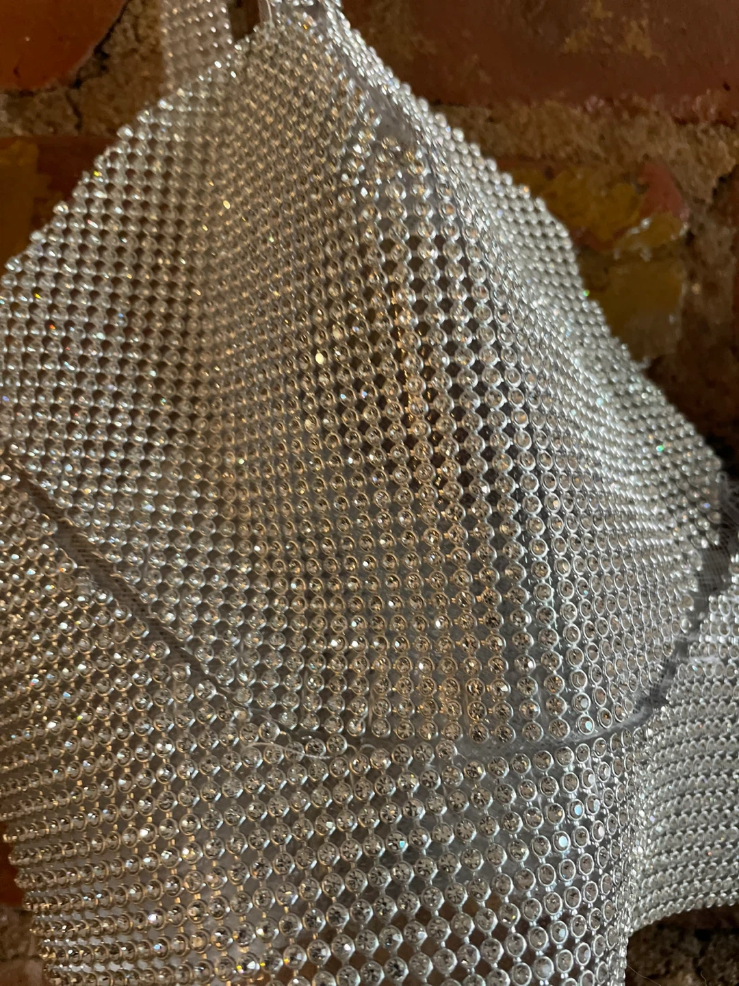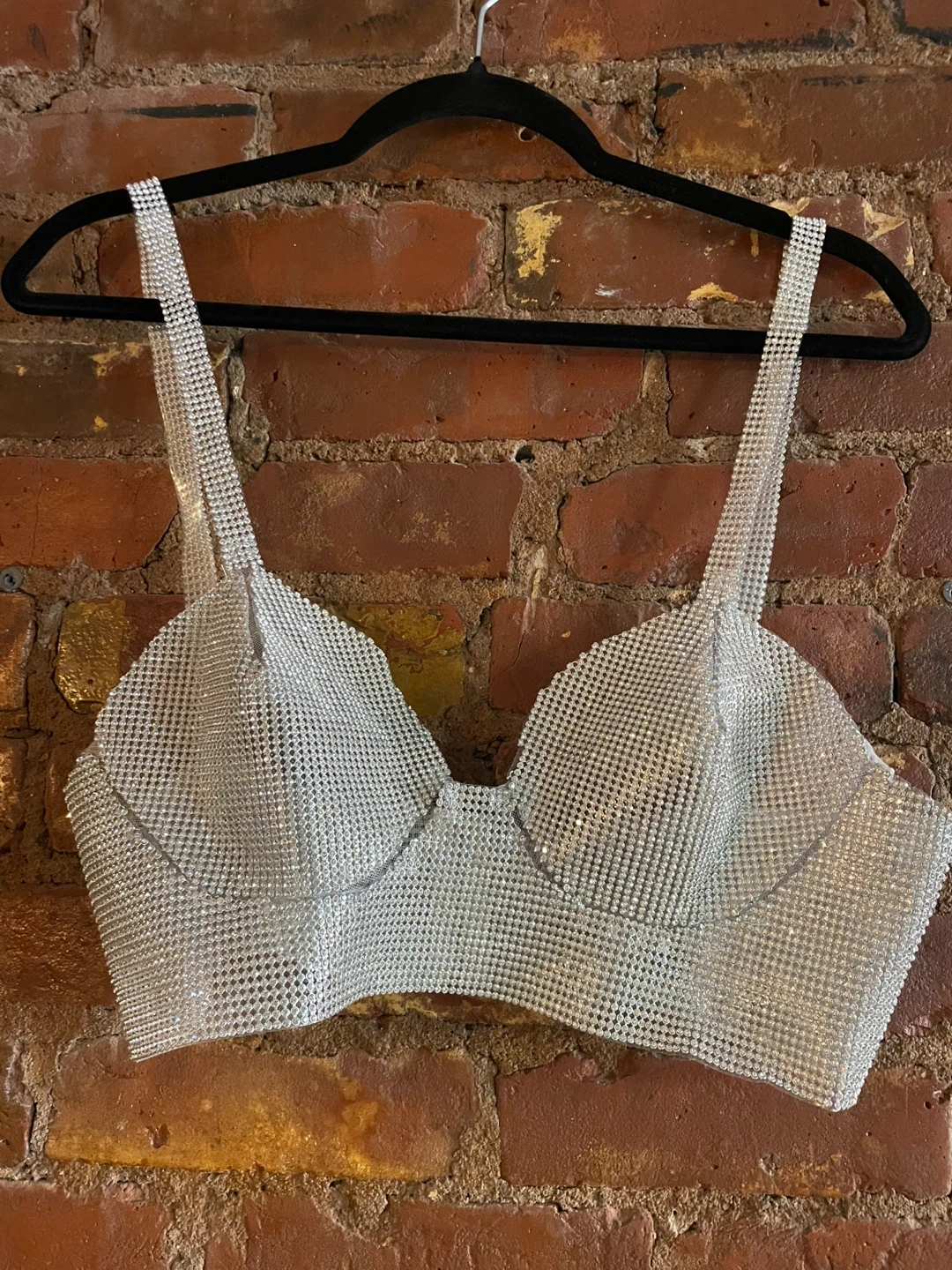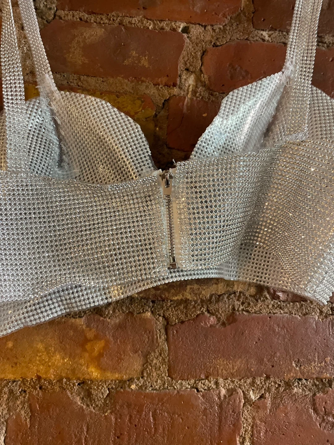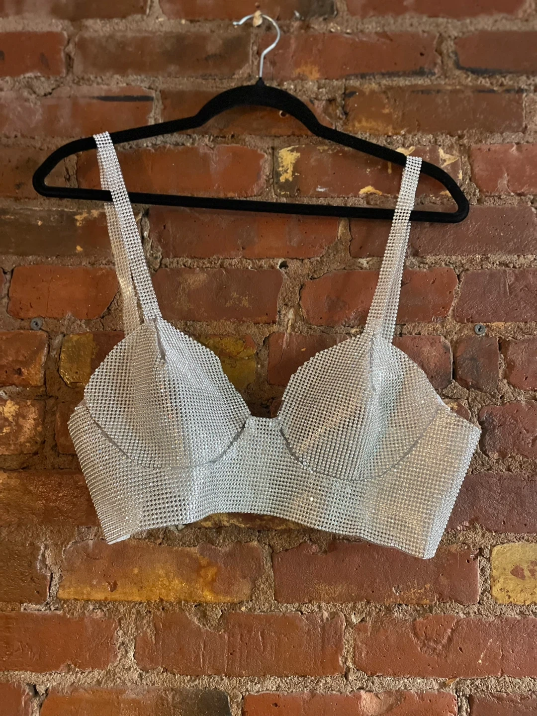 82Selling a cute silver SPARKLY completely rhinestone bra top! It has a zipper in the front and is in good condition. Perfect for a night out! Bought it at Trash and Vaudeville for $100 , has a little wear that’s not noticeable. 34B-C or medium