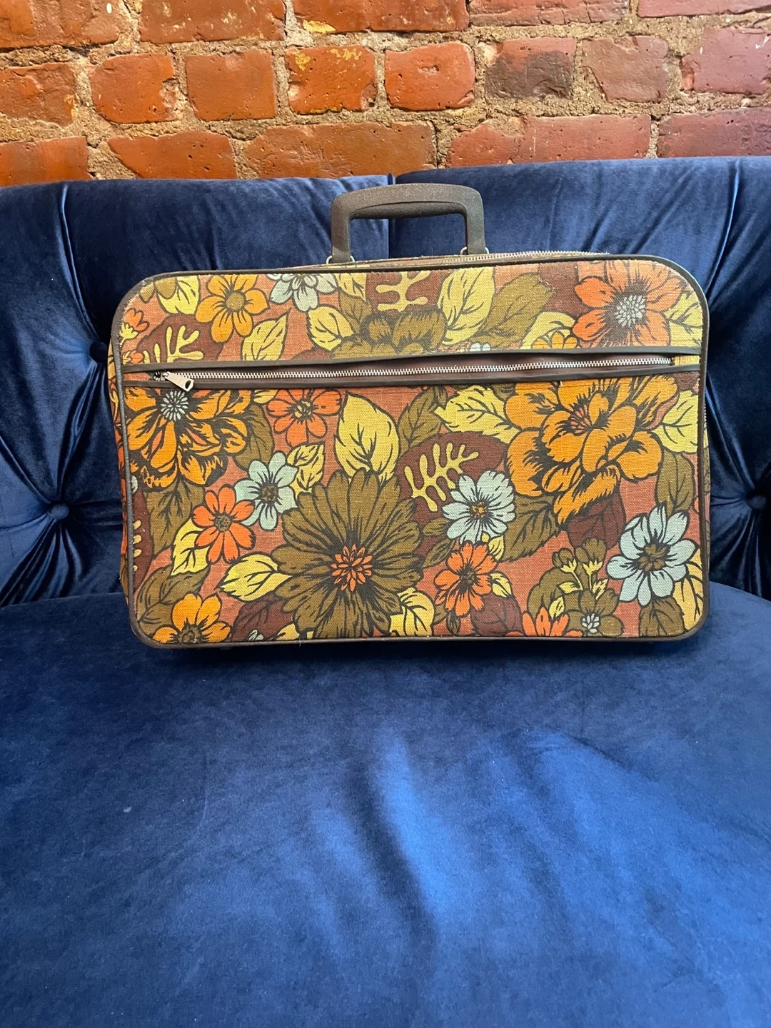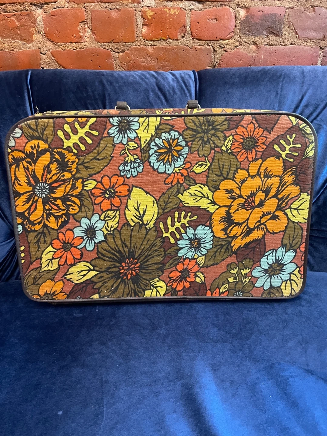 82Selling a vintage suitcase with a vibrant floral pattern! It's perfect for adding a touch of retro style to your travels or as a unique decorative piece. The suitcase features a zipper closure and a sturdy handle. It has a brown, orange, yellow, and blue floral design. Small size.
