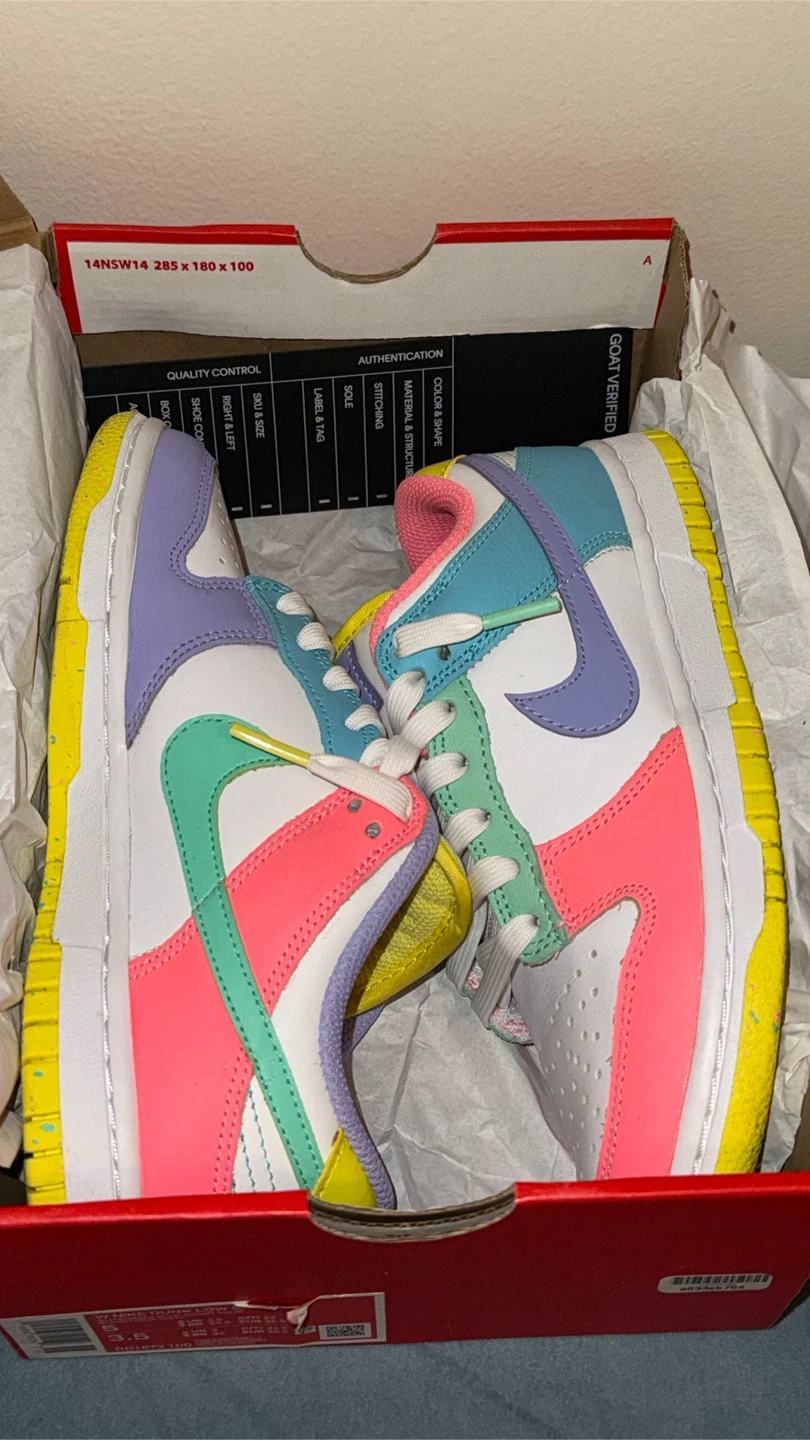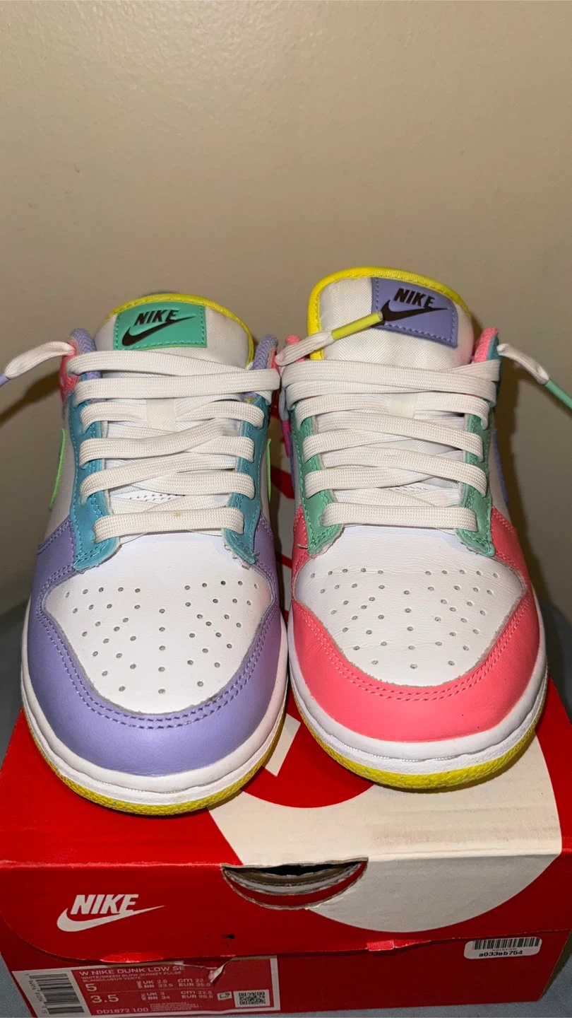 Selling a pair of Nike Dunk Lows in the fun Candy colorway! These are a women's size 5 and come with the original box. The shoes feature a mix of pastel colors like pink, blue, and lavender, making them a unique addition to your sneaker collection.