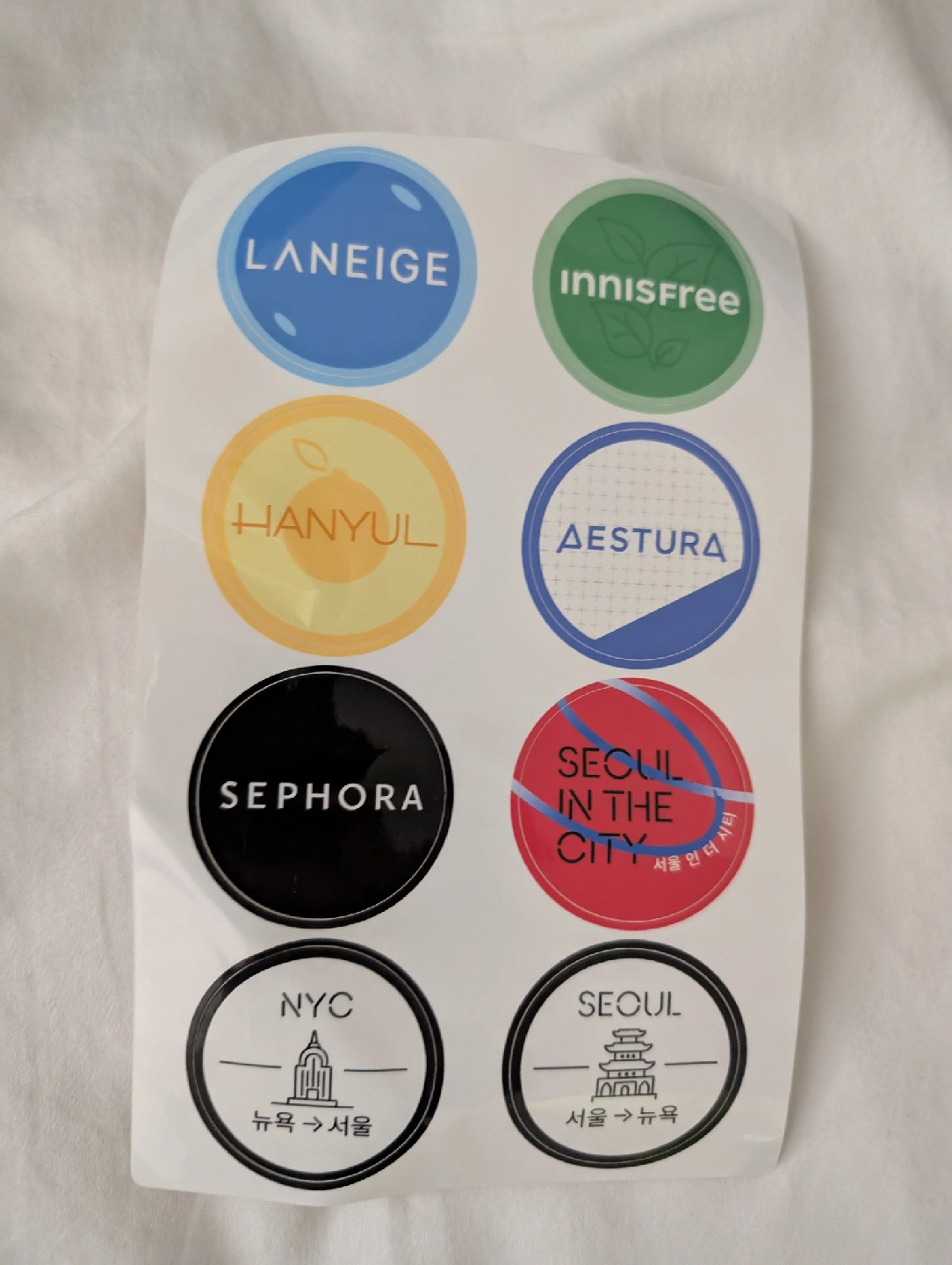 55Giving away a sheet of fun cosmetic brand stickers! Includes: - LANEIGE - Innisfree - HANYUL - AESTURA - Sephora - Seoul in the City - NYC - Seoul