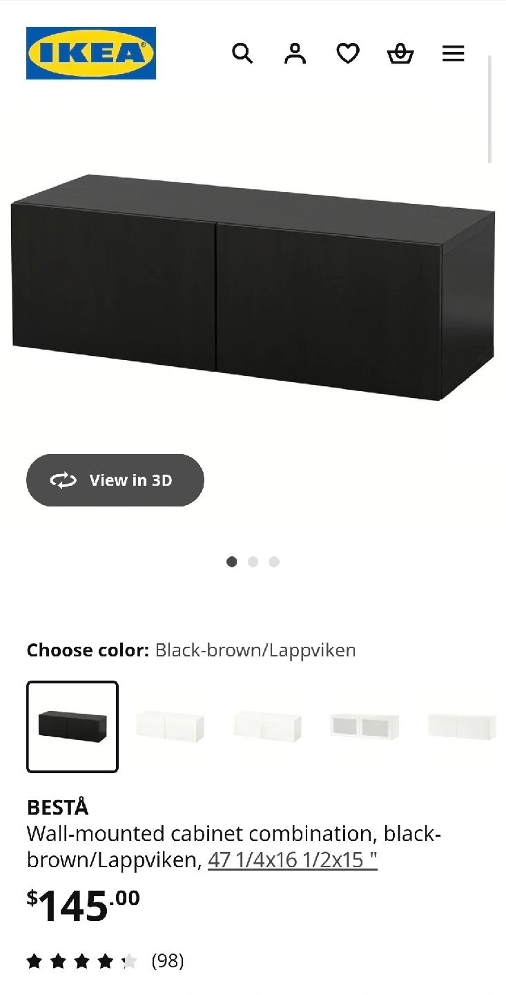Selling an IKEA BESTA wall-mounted cabinet combination in black-brown/Lappviken. It's in great condition and ready to add some stylish storage to your space! The dimensions are 47 1/4x16 1/2x15 ". Originally bought for $145