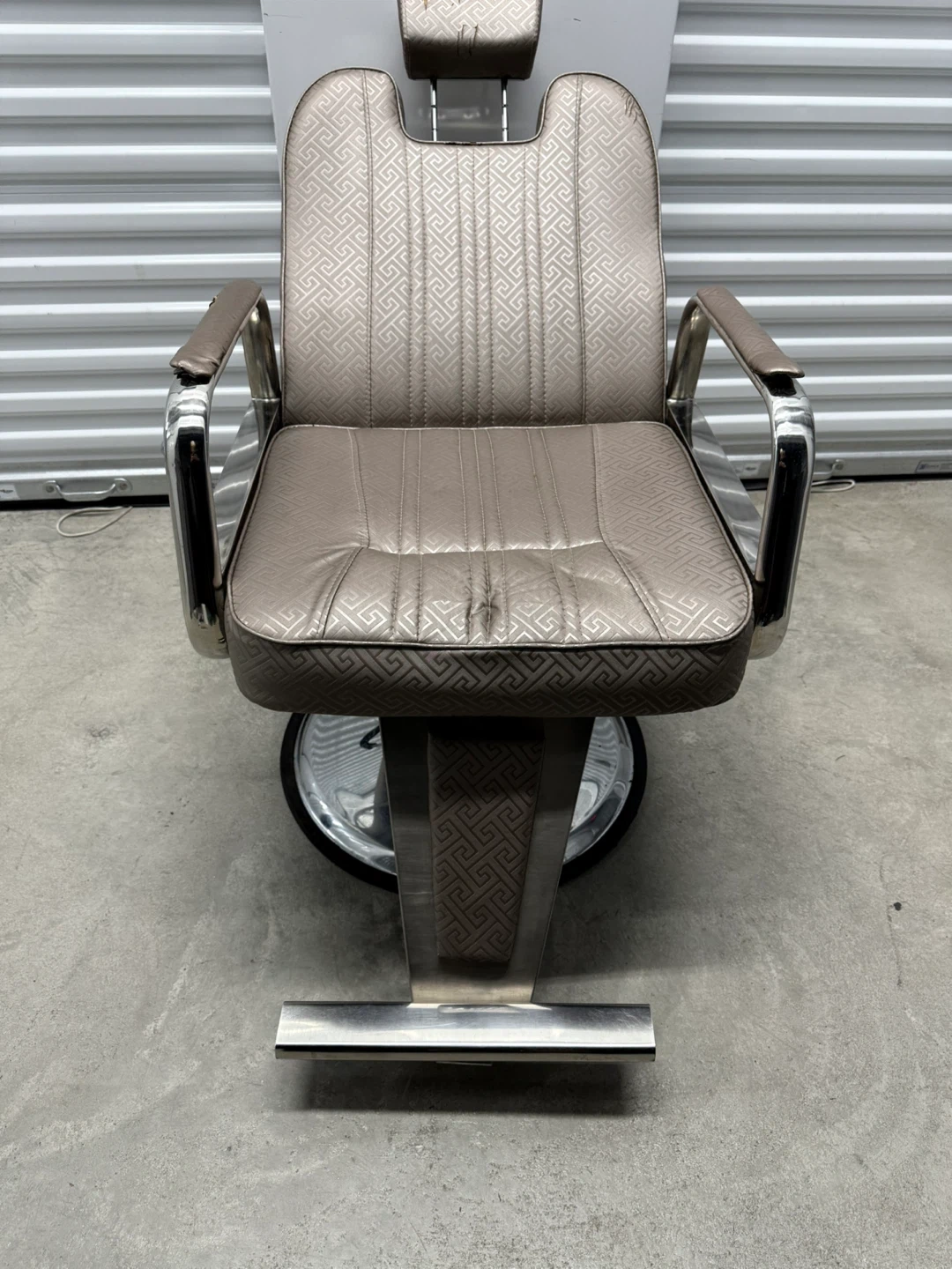 Selling a vintage barber chair in a tan color. It has a unique design and a footrest. There are some signs of wear on the seat, as shown in the pictures, but it's still a cool piece and would be great in a shop.