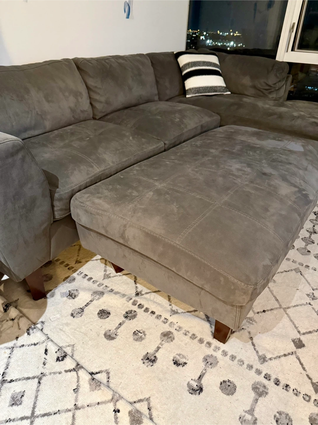 Selling a comfortable gray sectional sofa. It's in very good condition and perfect for a living room or entertainment space. I would keep it but my space I moved to is too small. The sectional includes a large ottoman. Couch is about 115” long, 36” wide. Ottoman is 65” long, 35” wide. Couch seat cushions are 38” long, 20“ depth. It is all in excellent condition. The ottoman has been sat on more than the couch and has some sagging on one side. I purchased taller legs as the ones the couch originally came with made the seating super low to the ground. One leg on the ottoman does not screw in very well. You can’t tell at all though when it is upright and I have had no issues.