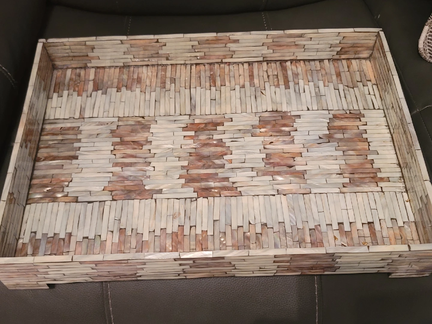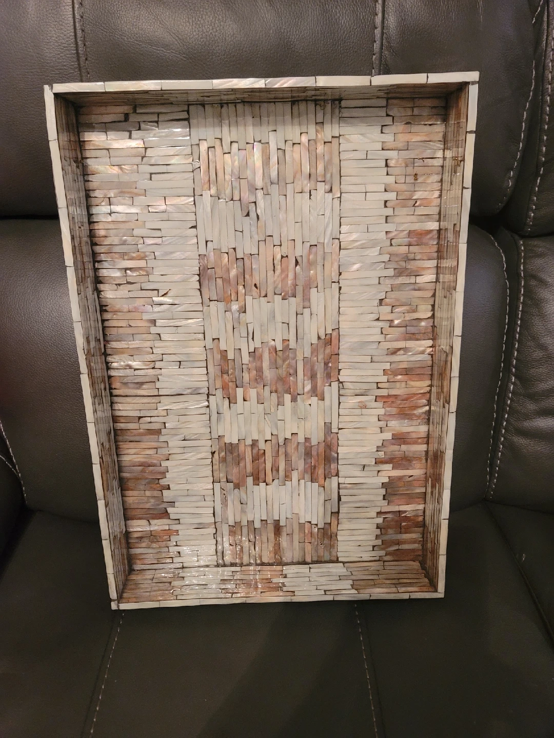 18This is a decorative tray featuring a mother of pearl design. It's perfect for adding a touch of elegance to any room. The tray is in good condition and ready for a new home! pick up in Merrick Ny CASH ONLY