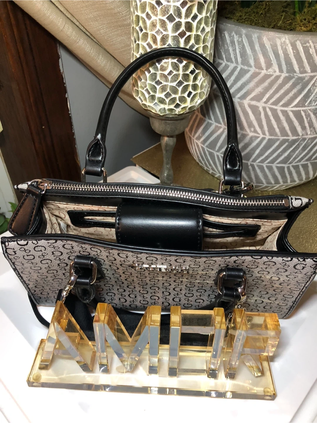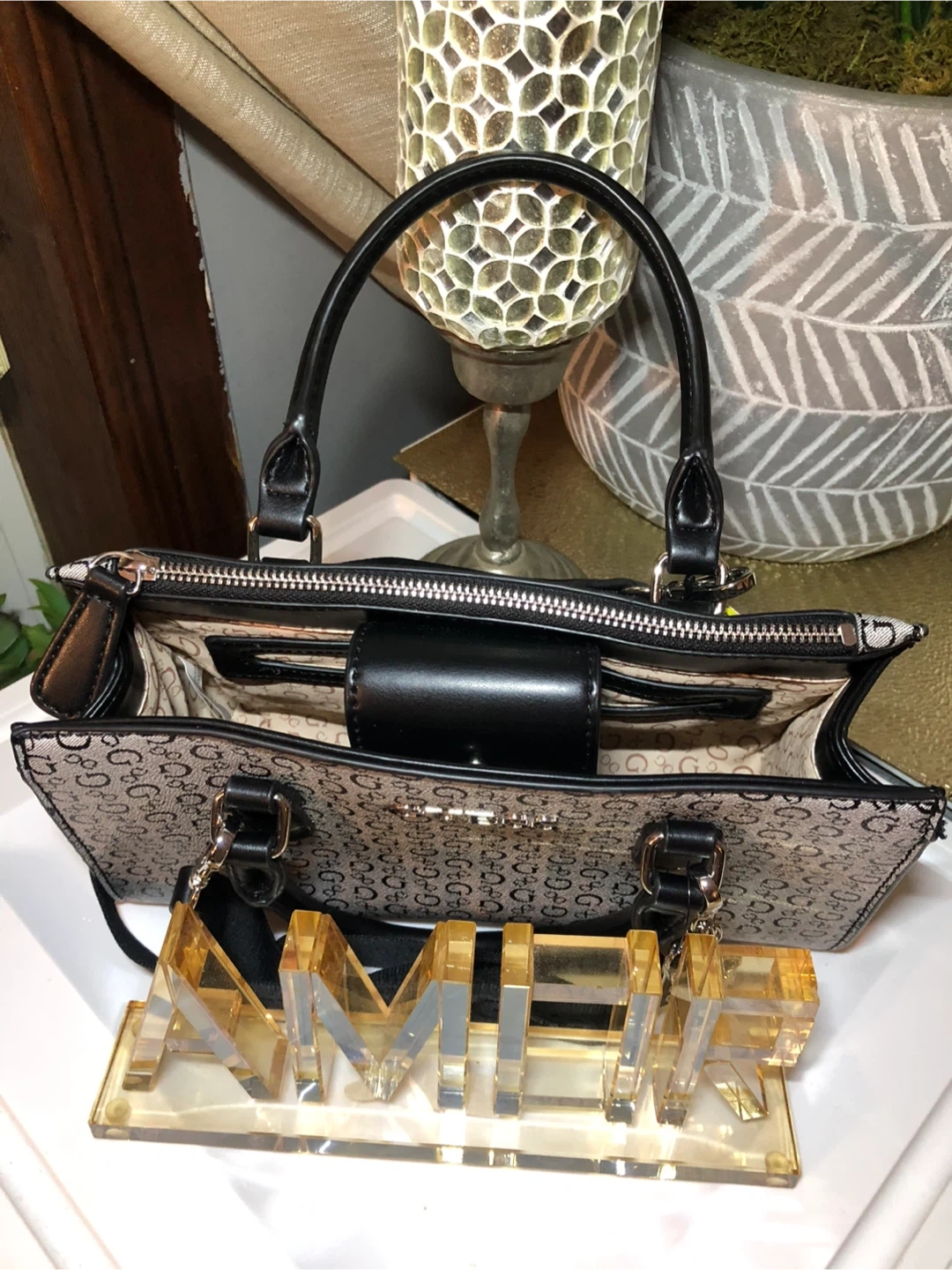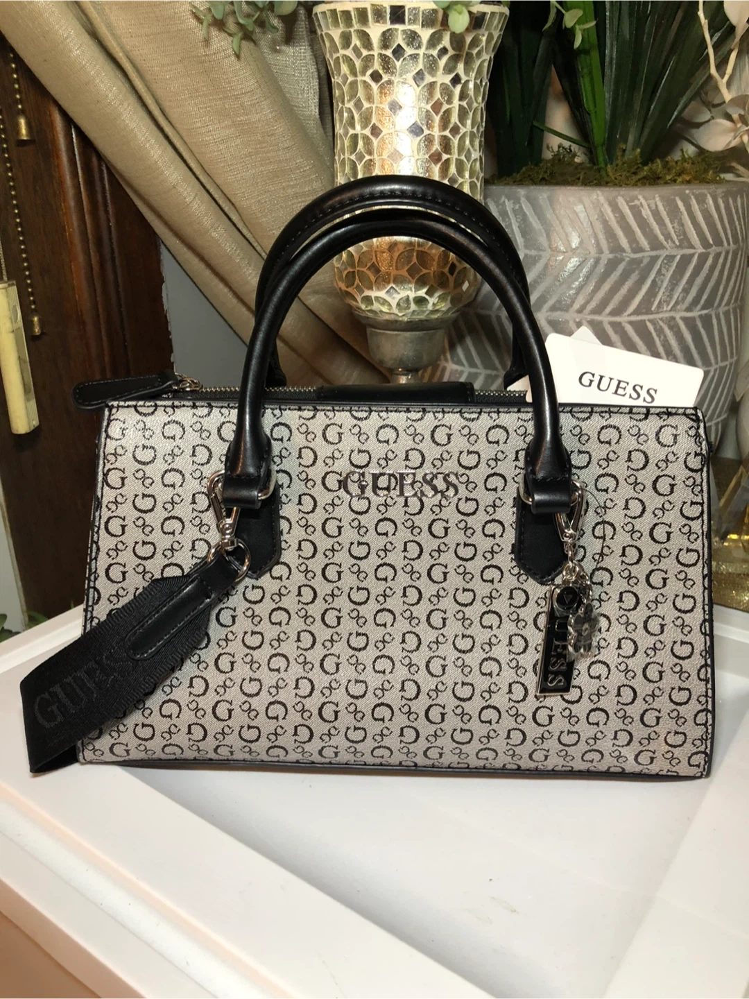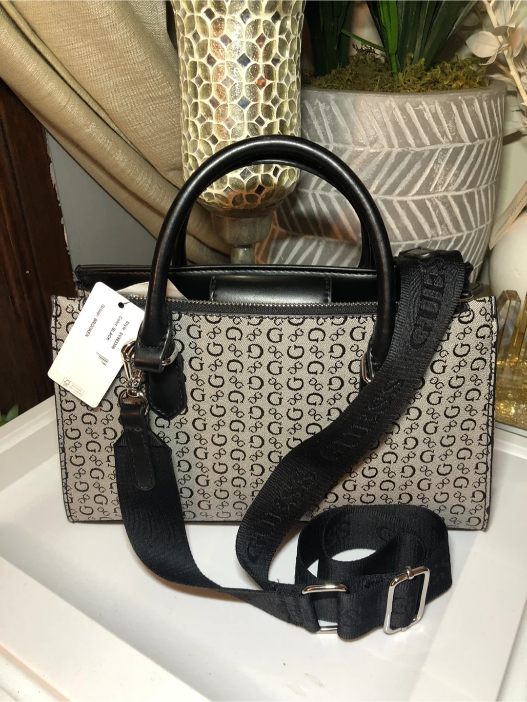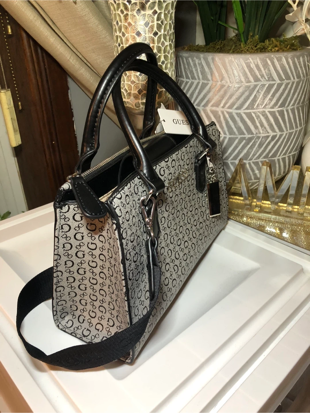37This is a Guess satchel purse in a black and white pattern with black handles and strap. It's in great condition and ready for a new home!