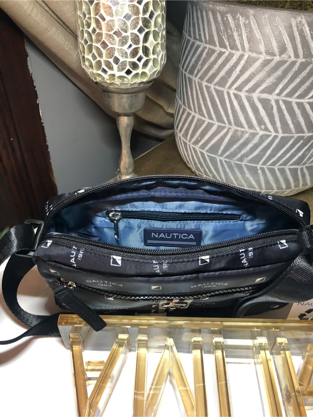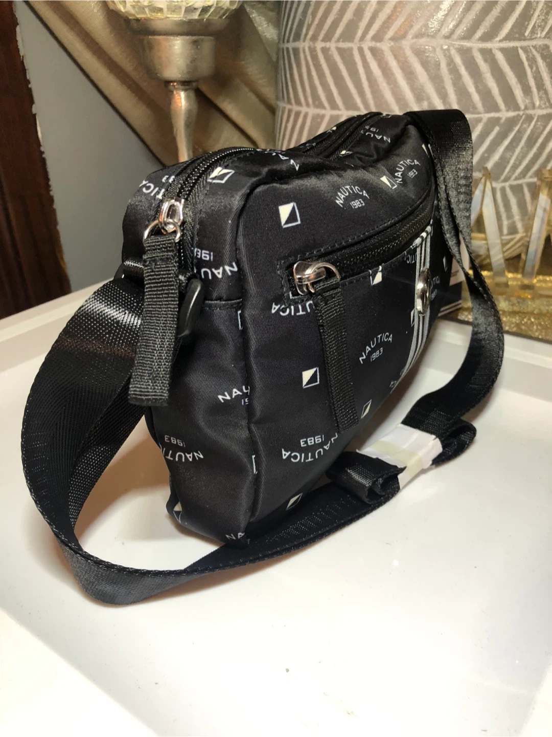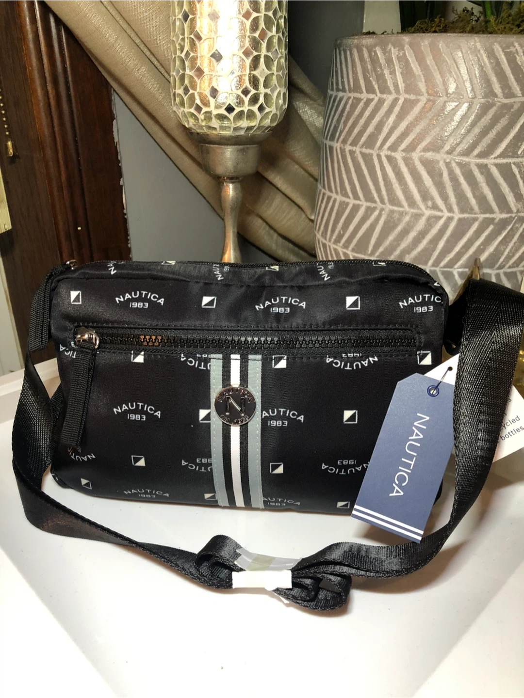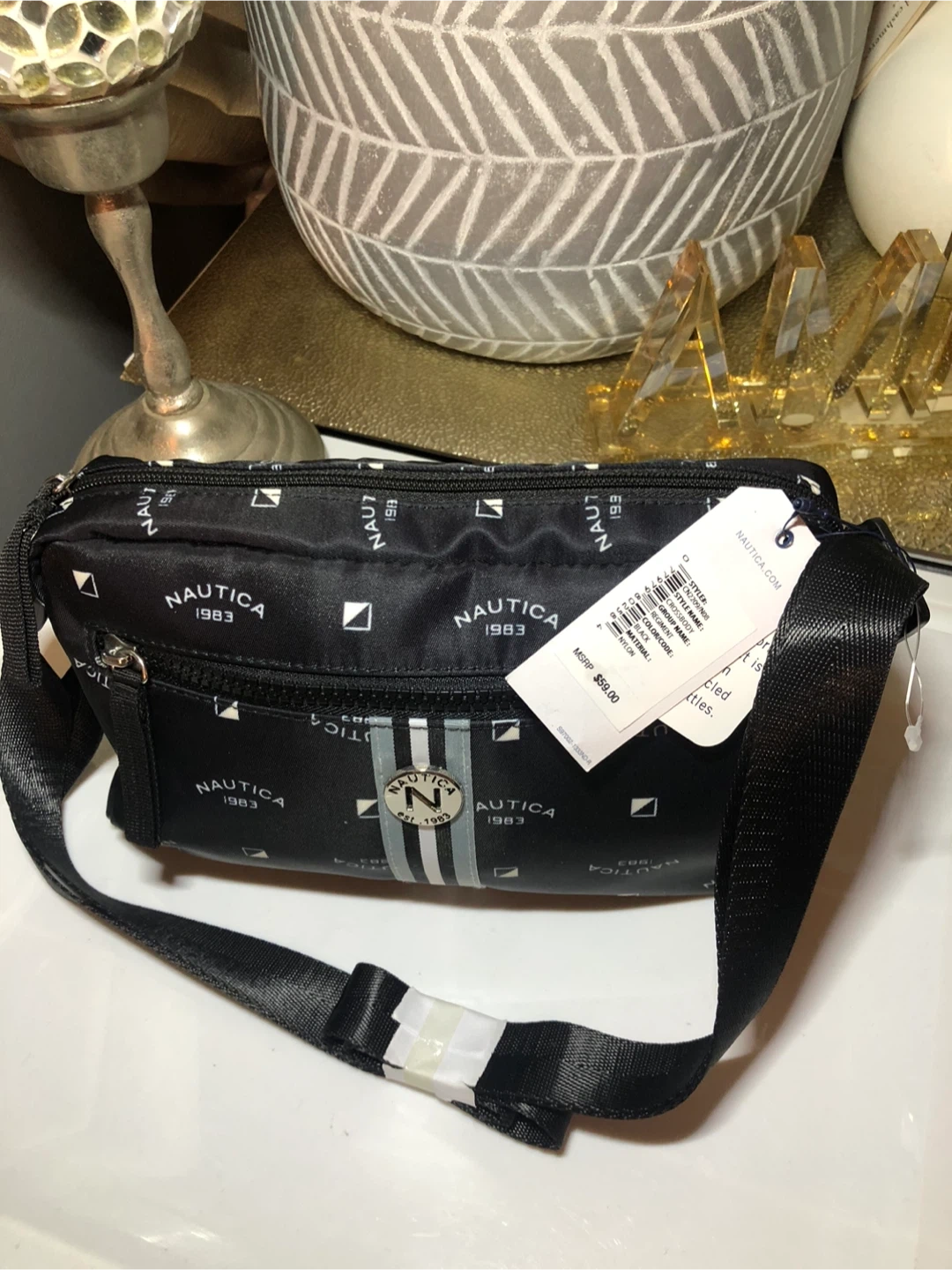 15This is a black belt bag from Nautica. It features the Nautica logo and '1983' printed throughout the bag. It has a black adjustable strap and a MSRP tag of $58.00.