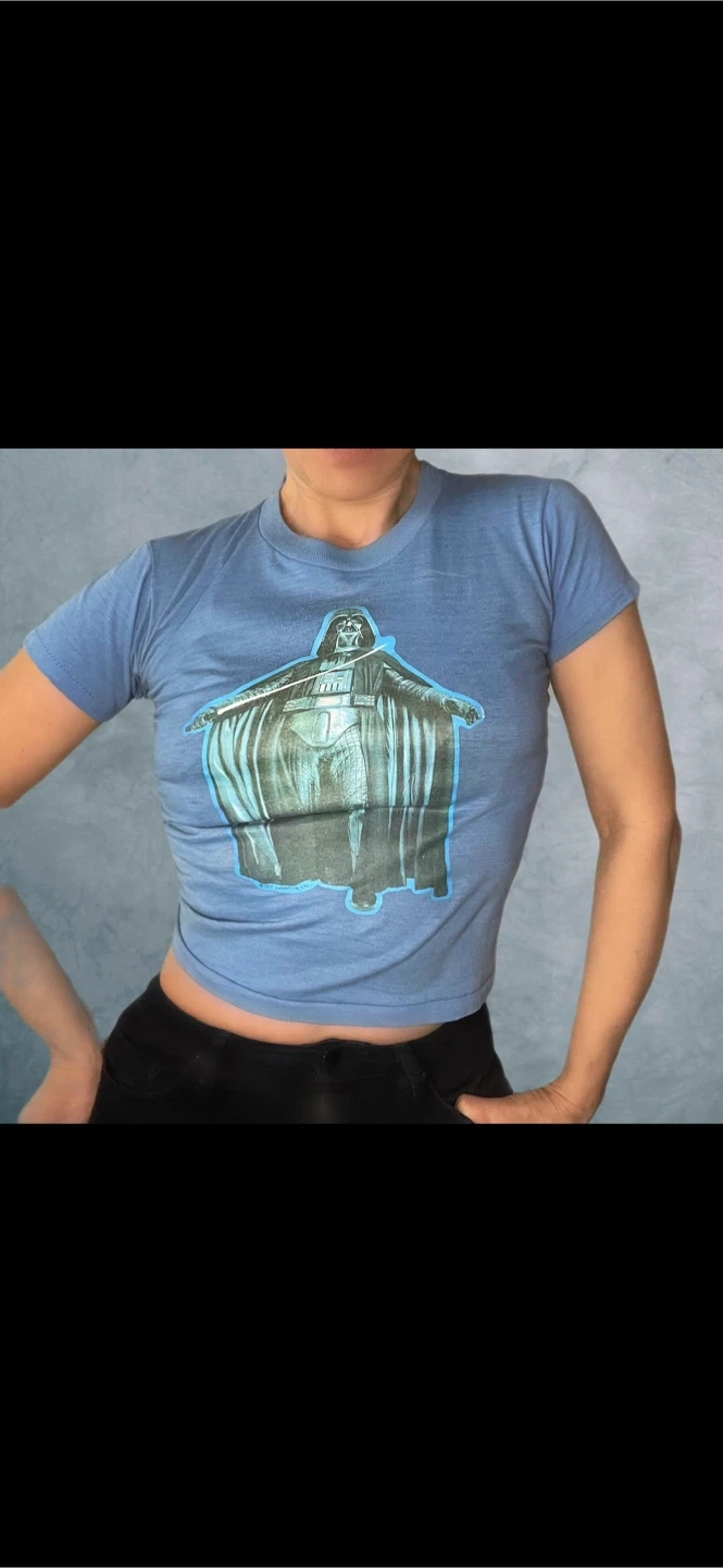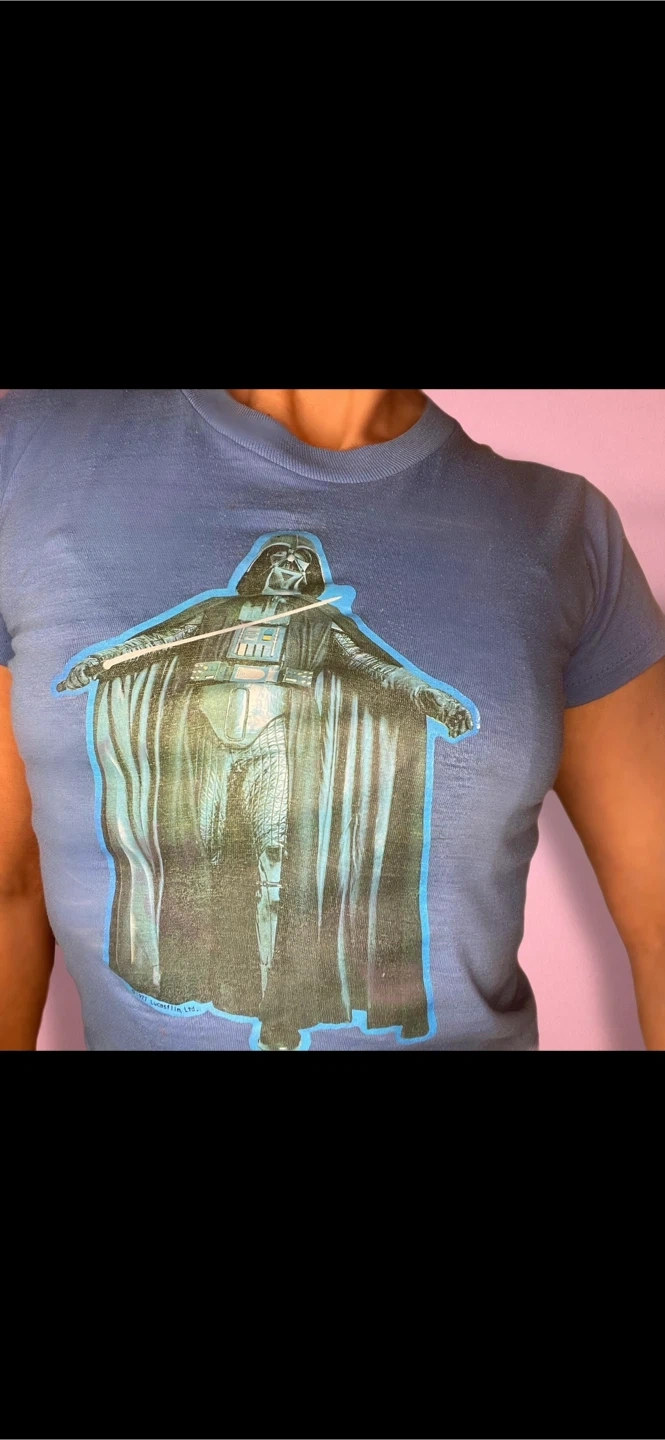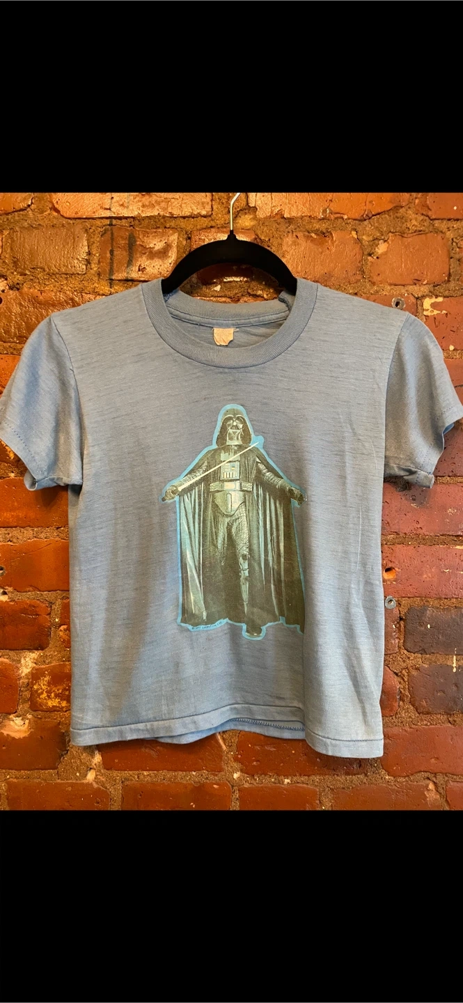 82Original 1977 Star Wars is a light blue t-shirt with a Darth Vader graphic. It's a unique piece of history that would be great for any Star Wars fan! Boys size 8 fits a woman XS. Single stitch . Screen Stars tag. Great condition. One of 3 in my collection see other listings. I’ll make a deal if anyone wants all 3 shirts. These sell on ebay for $300+ !
