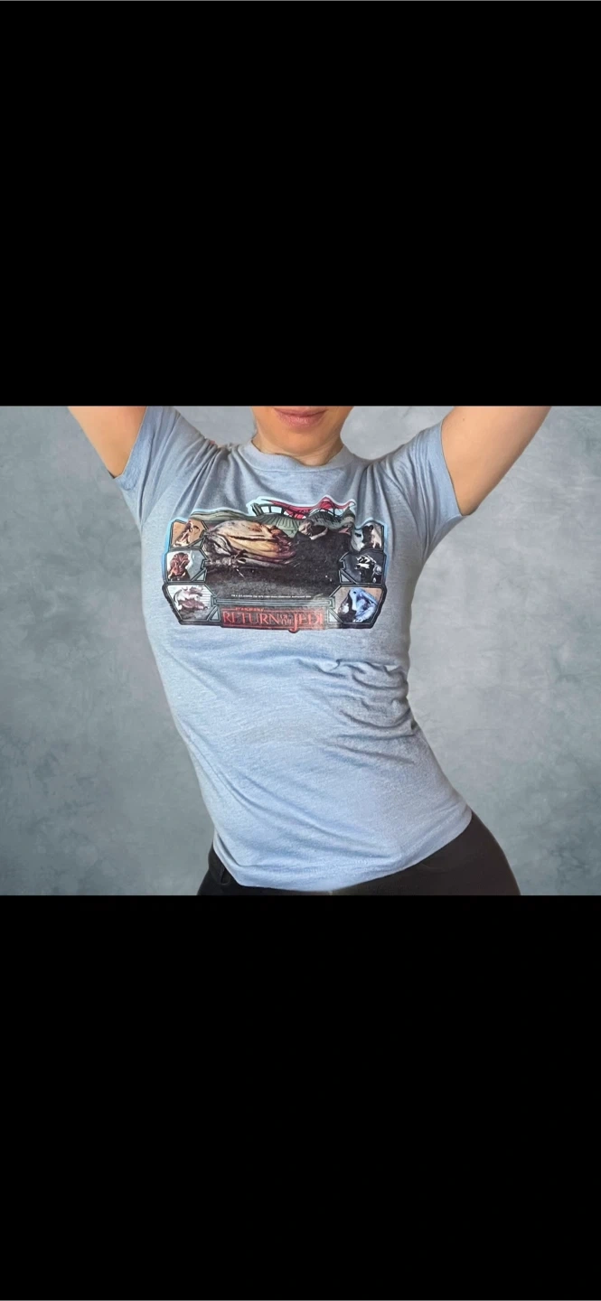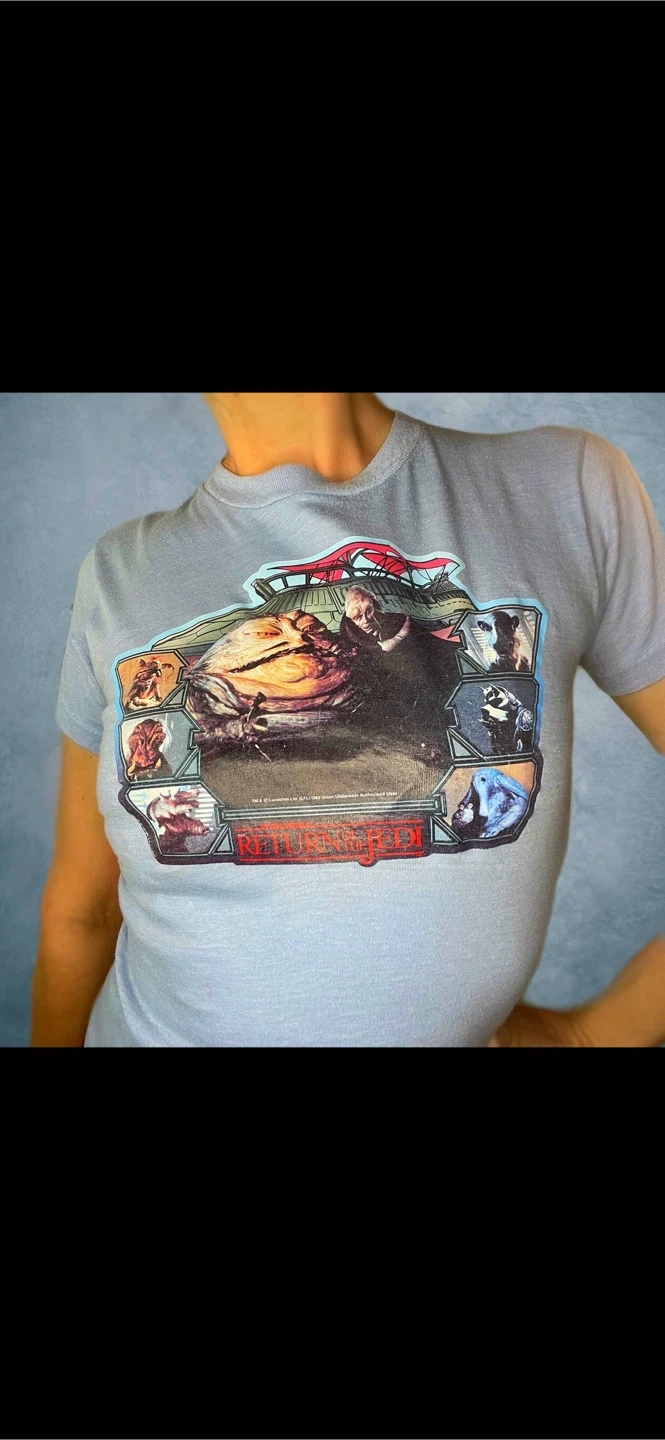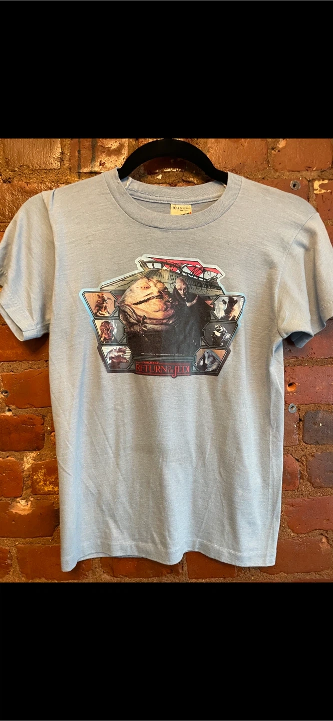 821983 authentic grail Star Wars Return of the Jedi t-shirt! It's light blue and features a graphic print from the movie of Jabba the Hut! Single stitch, Screen stars rage boys size 14-16 fits a woman small.