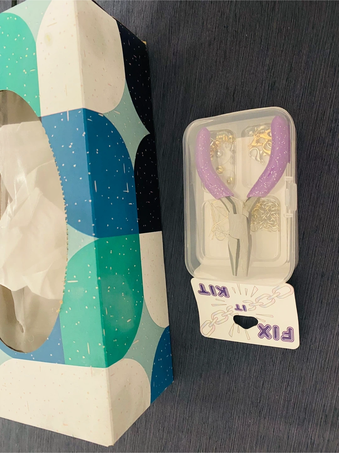 124Selling a brand new Fix It Kit Jewellery Repair Kit! This kit includes pliers with purple handles, various clasps, jump rings, and other findings to repair jewellery. Perfect for anyone who enjoys crafting or needs to fix their favourite pieces. Cash only