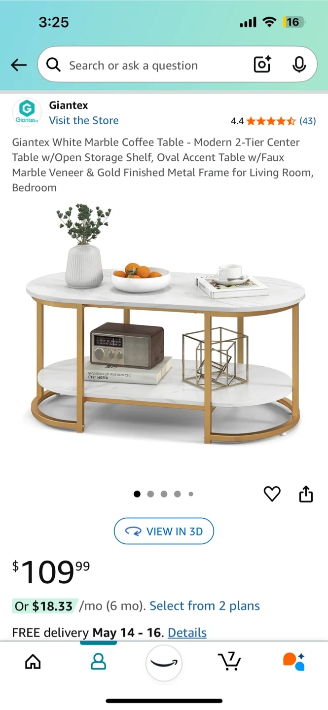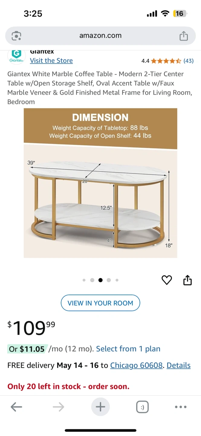 Selling a Giantex white marble coffee table. It's a modern 2-tier center table with an open storage shelf. The table has an oval accent and a faux marble veneer with a gold finished metal frame, perfect for a living room or bedroom. The tabletop can hold up to 88 lbs, and the open shelf can hold up to 44 lbs. Dimensions are 39" x 20" x 18". Originally bought for $109.99