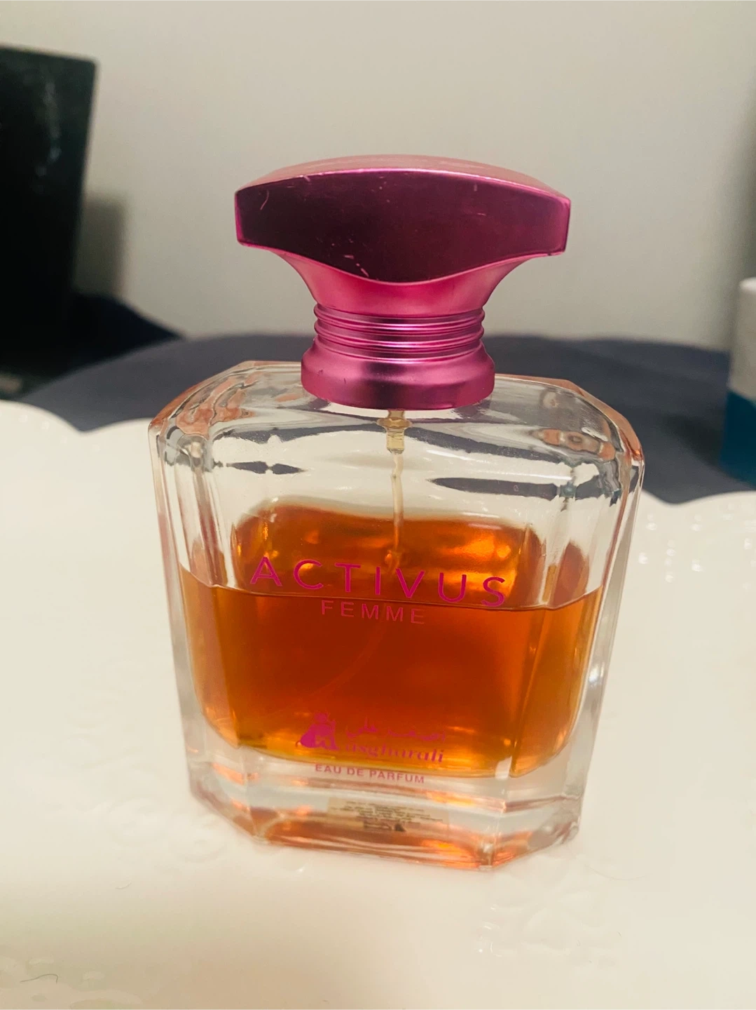 124Discover the captivating scent of Asgharali Actvius Femme, a 100 ml Eau de Parfum housed in an elegant glass bottle with a distinctive pink cap. This used fragrance offers a unique olfactory experience. * Brand: Asgharali * Name: Actvius Femme * Type: Eau de Parfum * Size: 100 ml Note: No box included Cash only