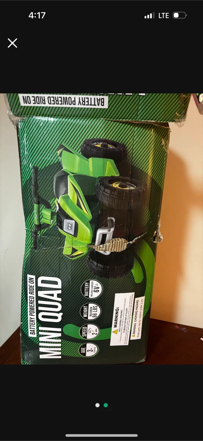 Selling a brand new Mini Quad battery-powered ride-on toy, still in its original box! It's designed for kids aged 3+ and has a maximum speed of 2 mph. It can support a maximum weight of 66 lbs. The battery is 6V and includes a charger. It's all ready for a little one to enjoy!