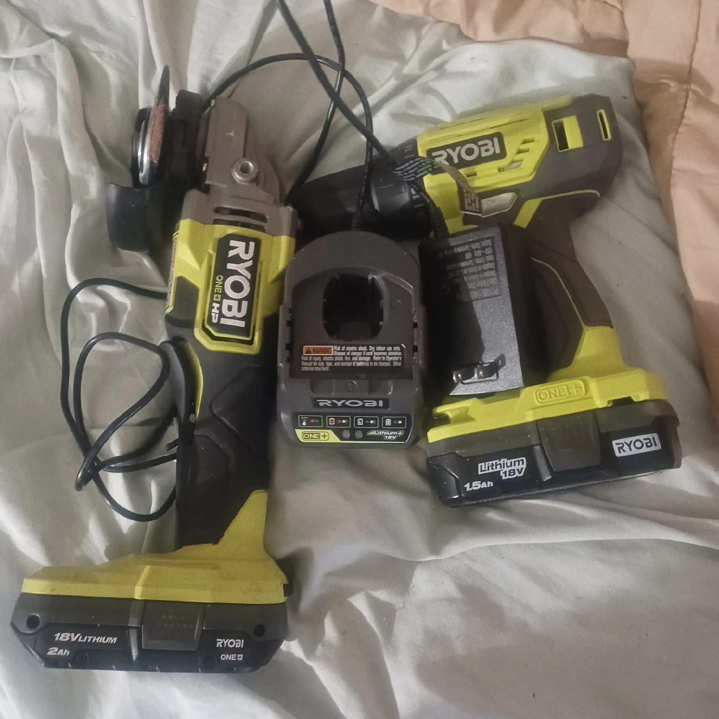 10Selling a Ryobi ONE+ power tool set. Includes a drill, angle grinder, battery charger, and two batteries (1.5Ah and 2Ah).