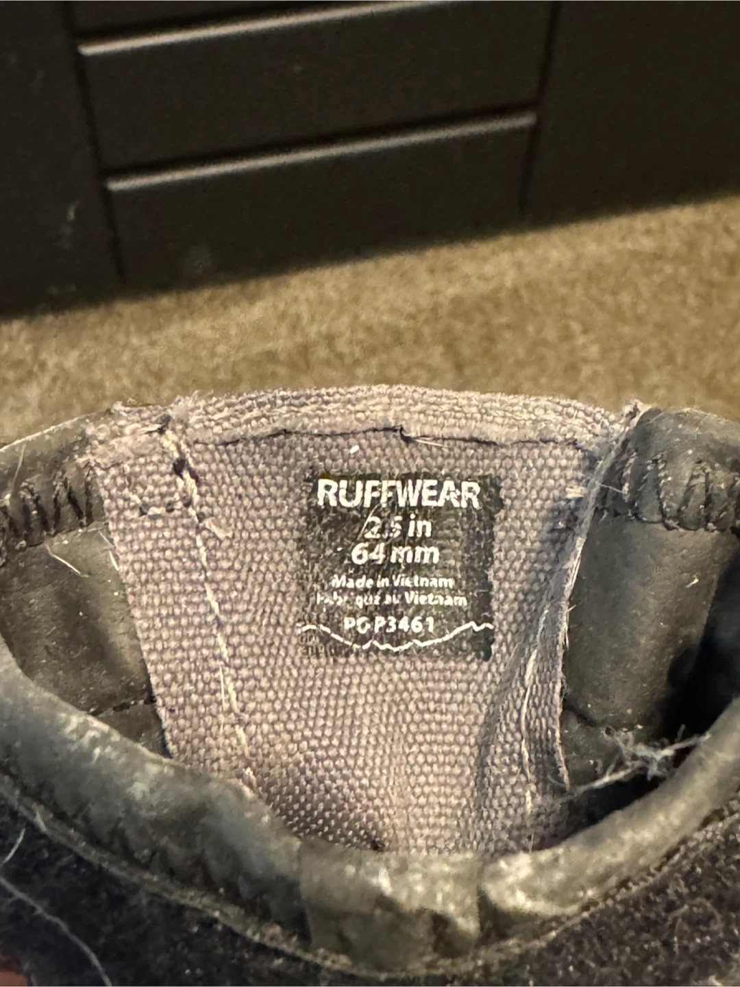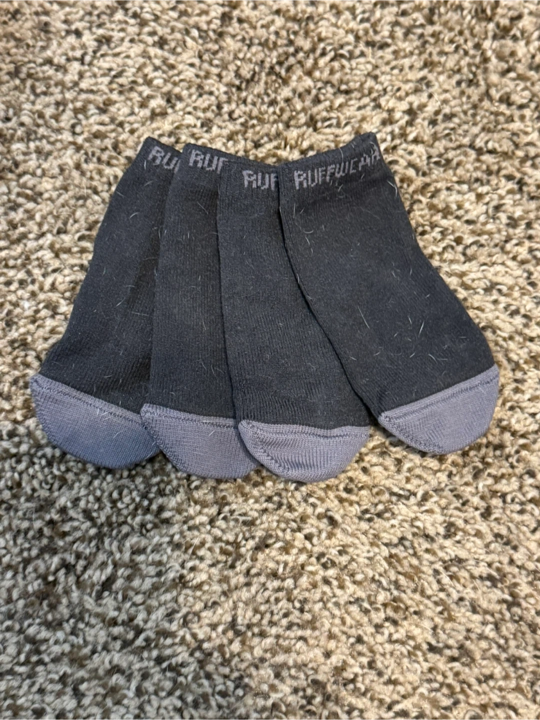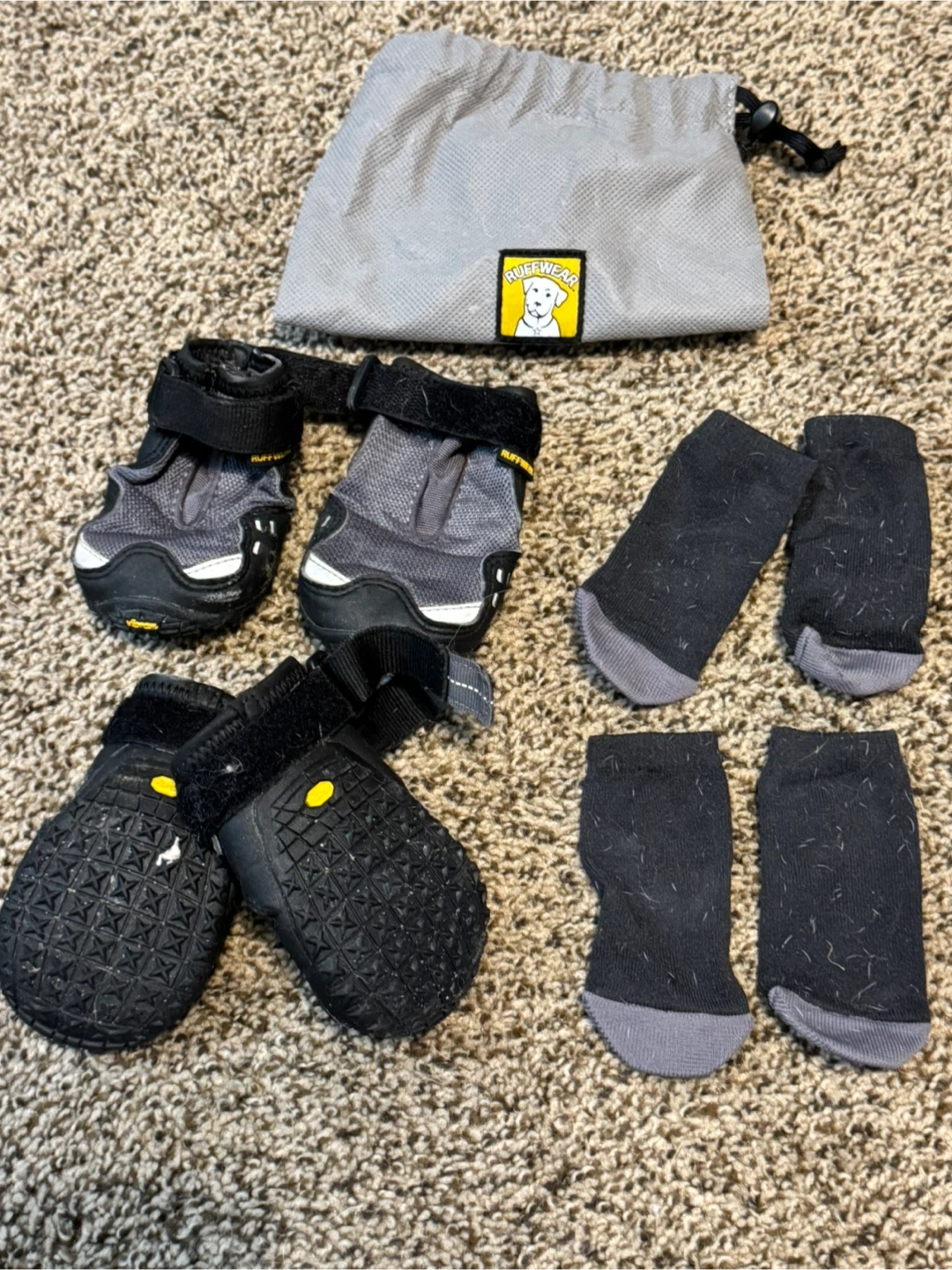 77Selling a set of Ruffwear dog boots and socks. The boots are size 2.5 in (64mm). Comes with a carrying bag and four socks.