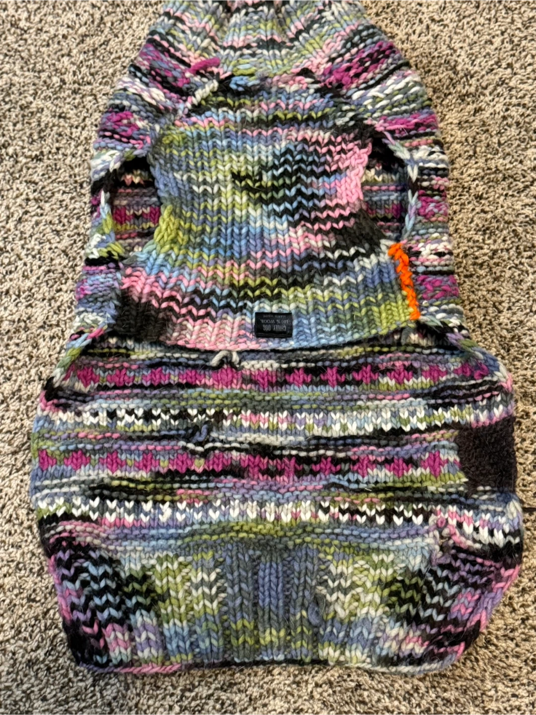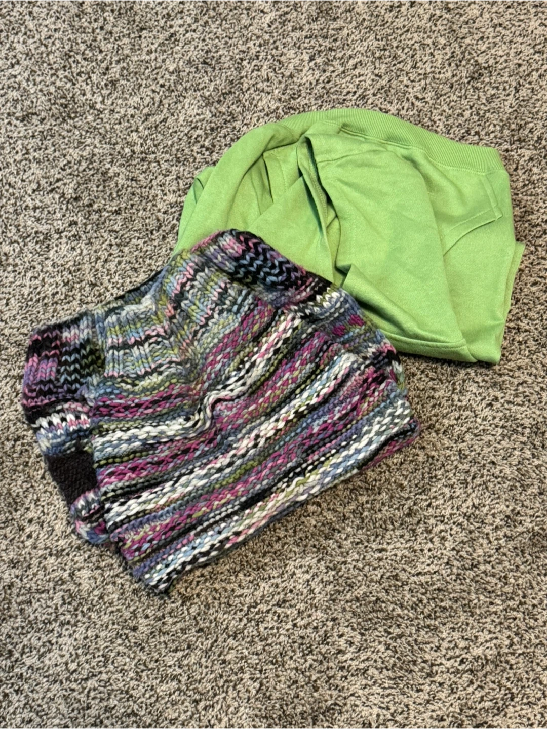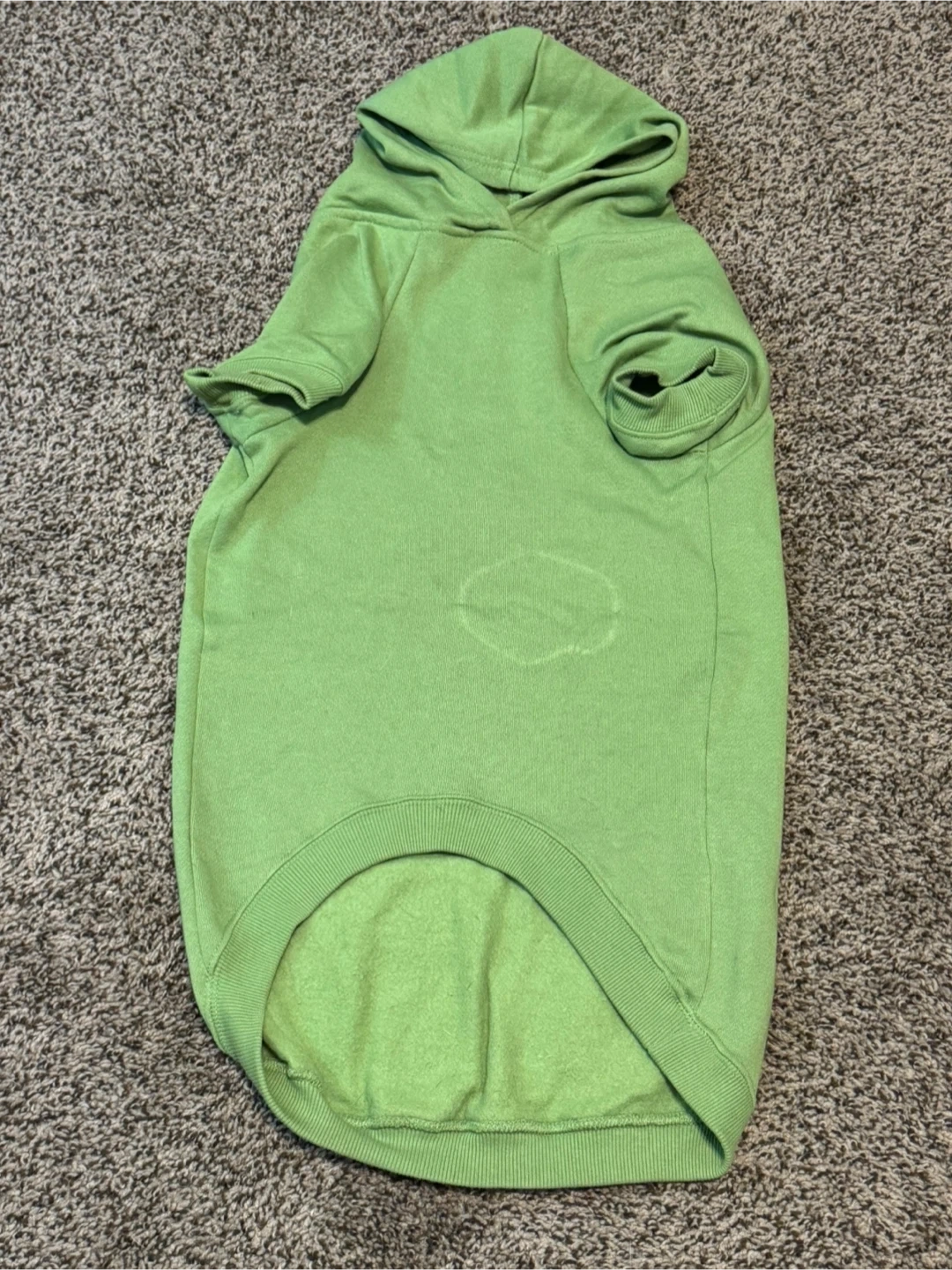 77Two cute dog sweaters! One is a colorful knit sweater, and the other is a green hoodie. Both are in good condition and ready for a new furry friend