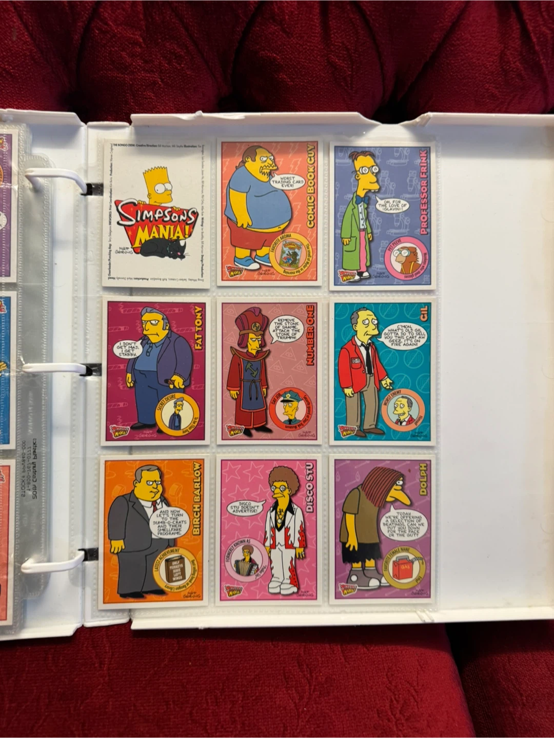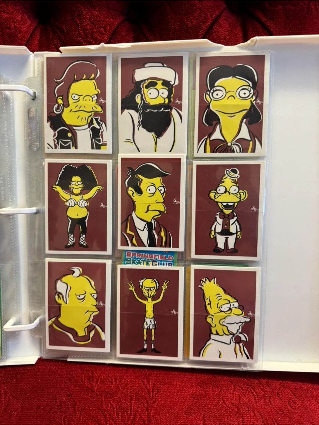 Here is a collection of The Simpsons trading cards. They feature various characters and food items from the show. Perfect for any Simpsons fan!