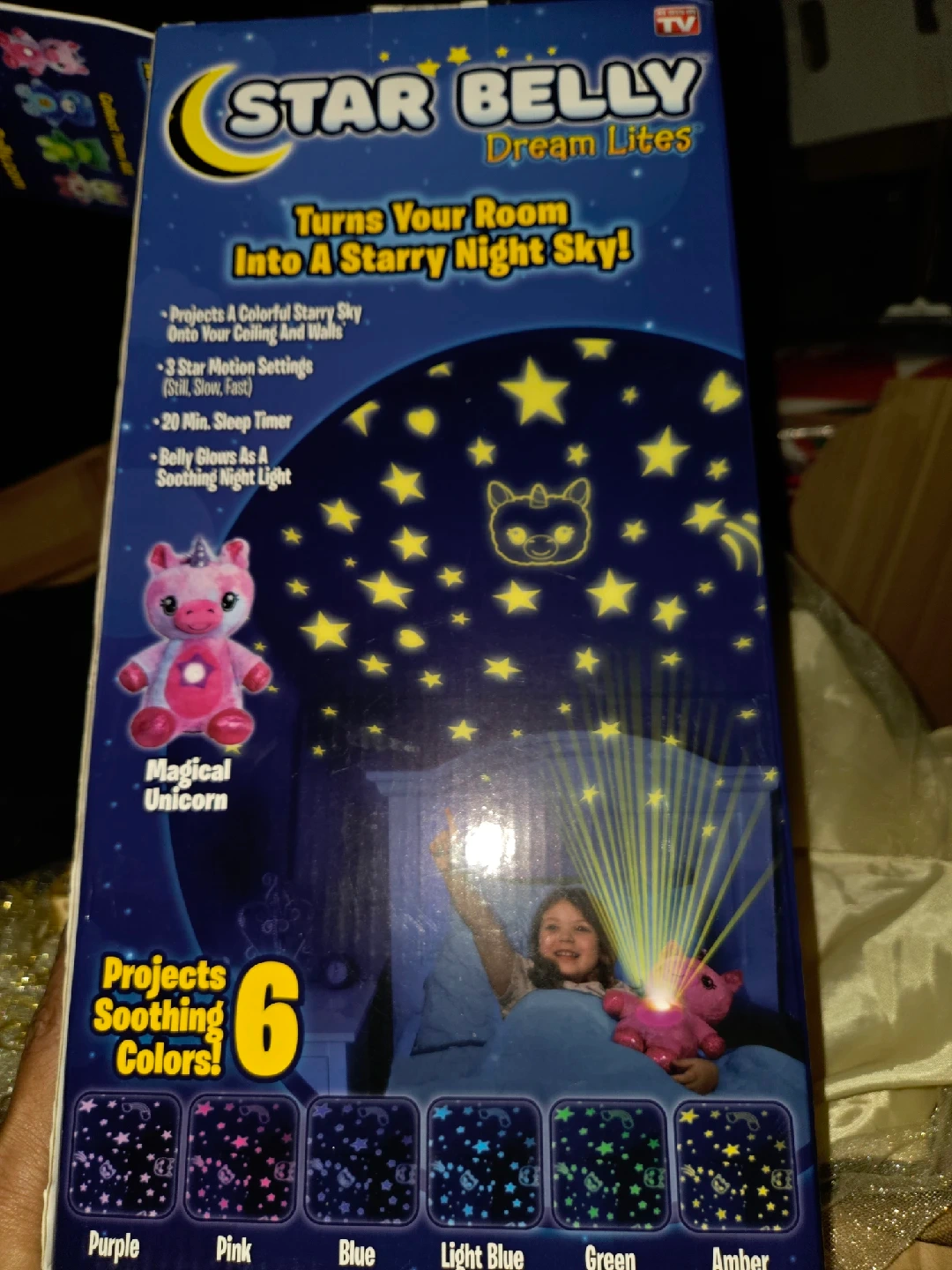 32This is a Star Belly Dream Lites Magical Unicorn night light. It projects soothing colors and turns your room into a starry night sky! Features include: - Projects a colorful starry sky onto your ceiling and walls - 3 Star motion settings (Still, Slow, Fast) - 20 Min. Sleep Timer - Belly glows as a soothing night light Ages 3 & Up!