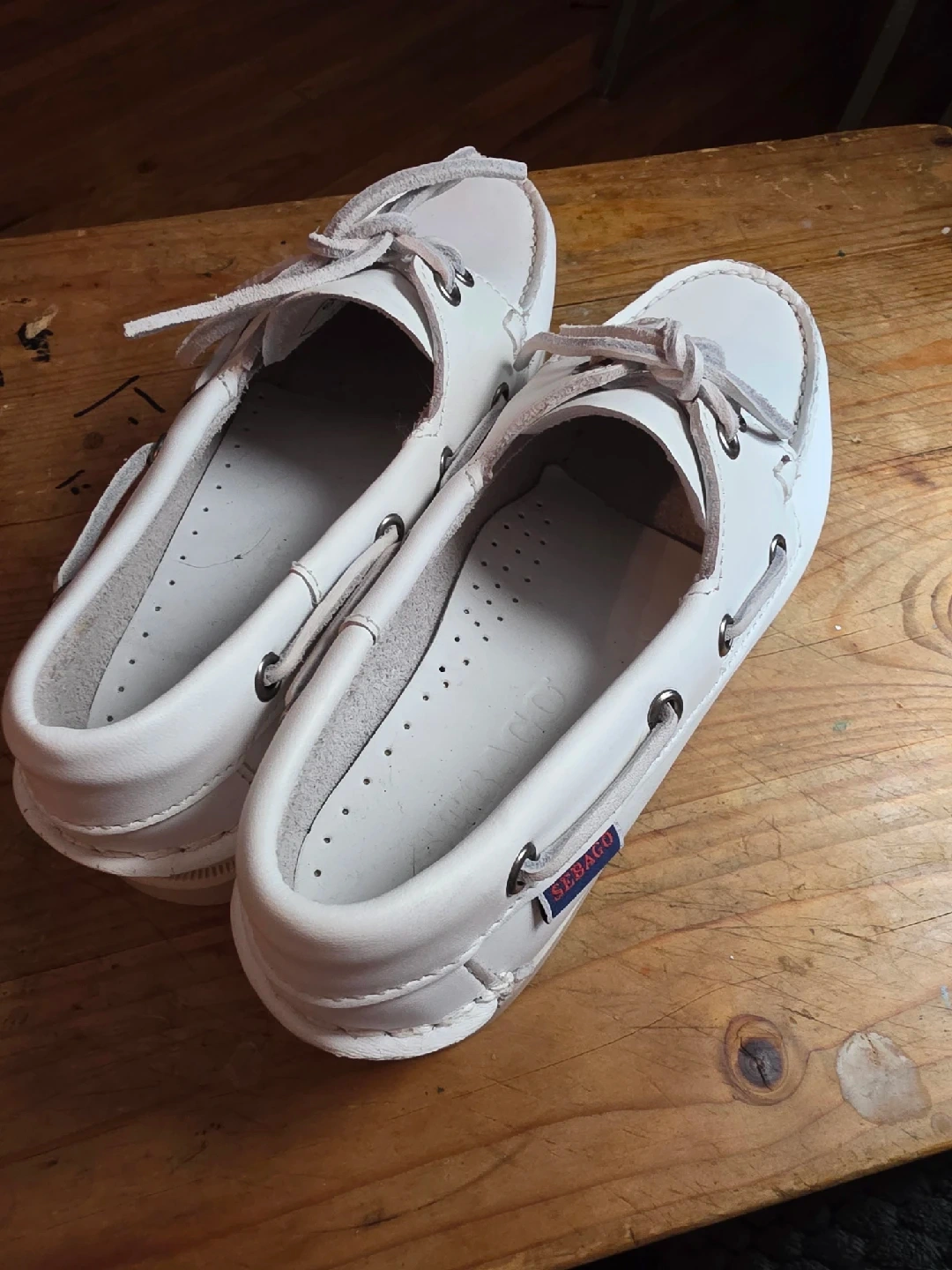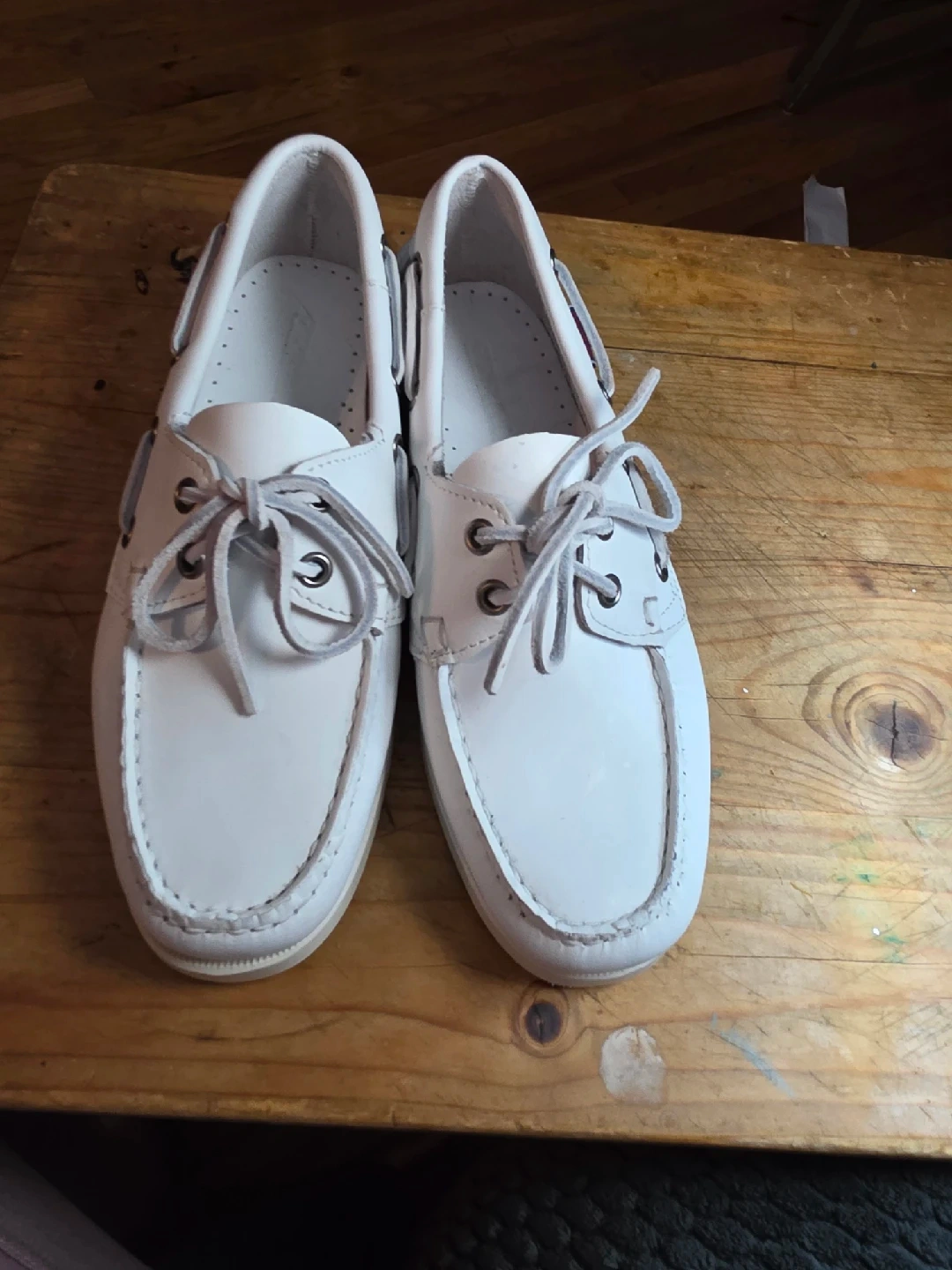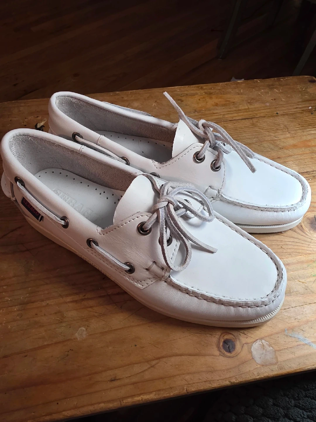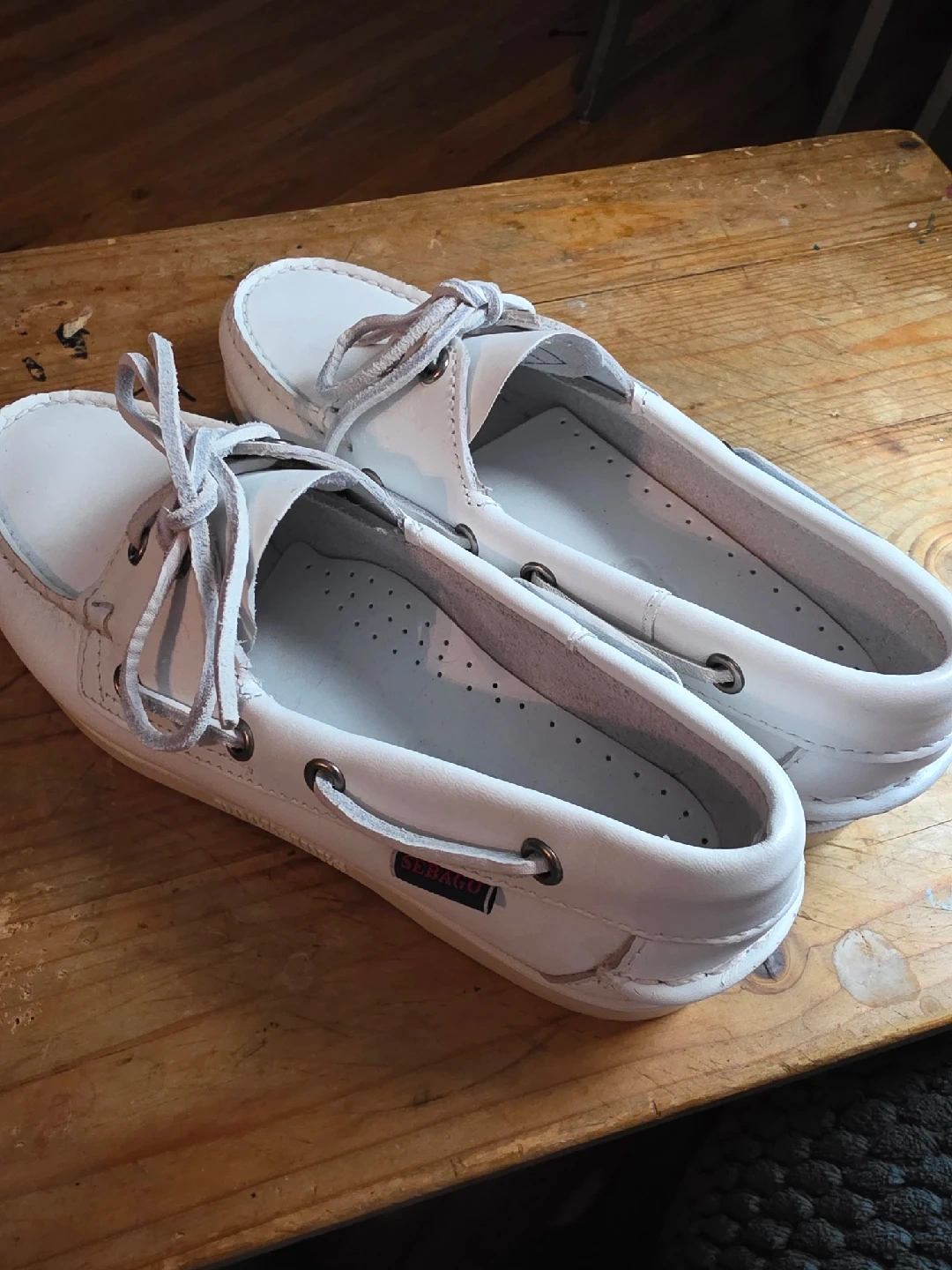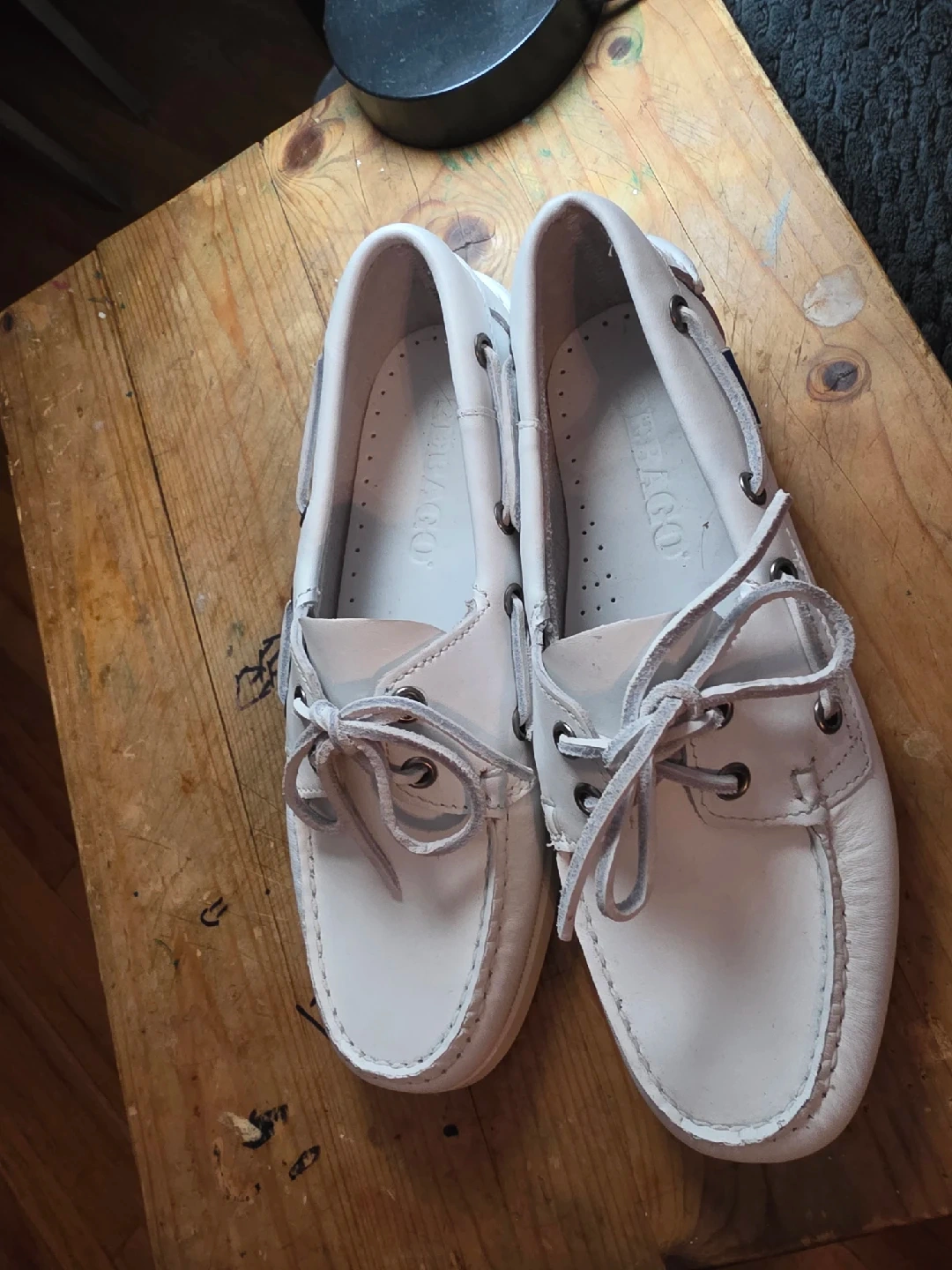15Selling a pair of Sebago Docksides boat shoes in white! These are a classic style and would be a great addition to your wardrobe. They show some signs of wear but are still in good condition and ready for a new home
