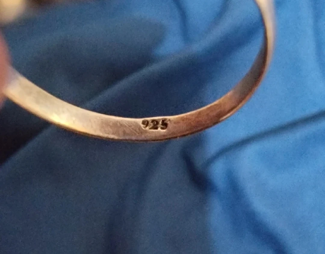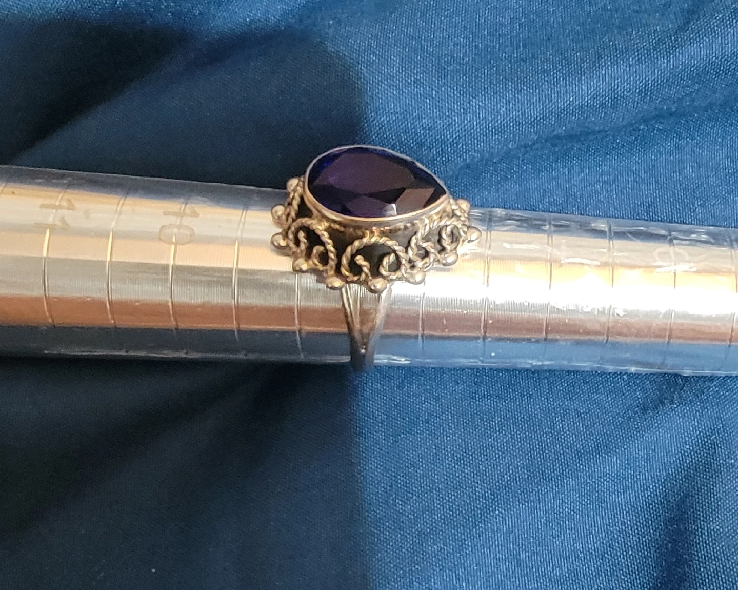 Selling a vintage sterling silver ring with a beautiful dark blue stone. The ring is marked with Mex '925' indicating its sterling silver composition. The ring has a unique, ornate design around the stone. It's a lovely piece!