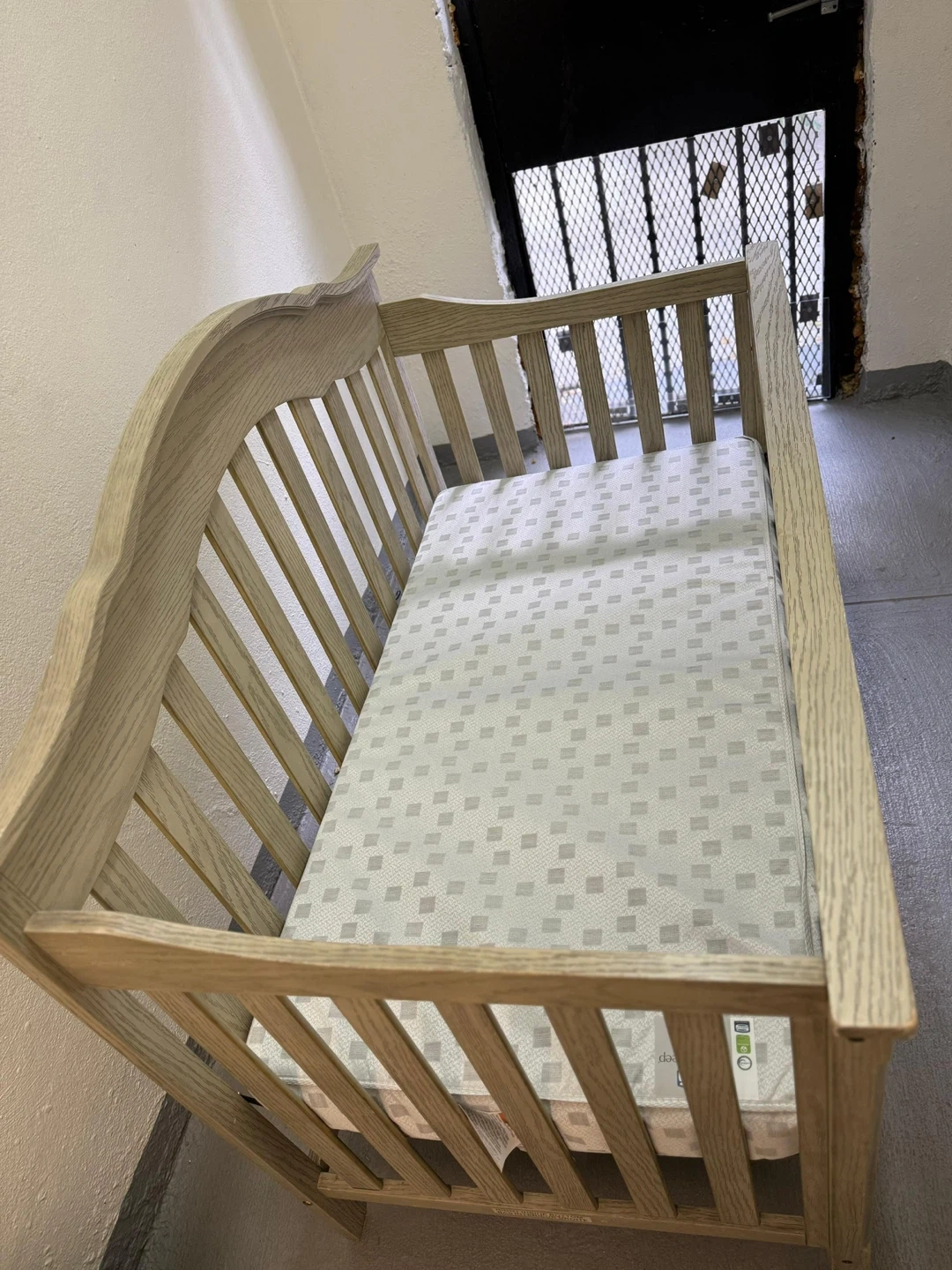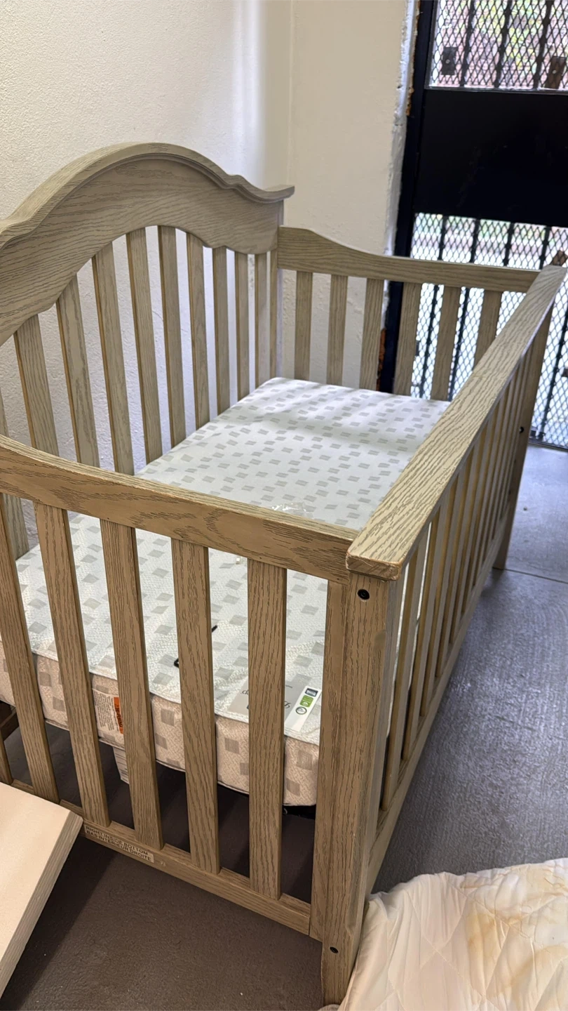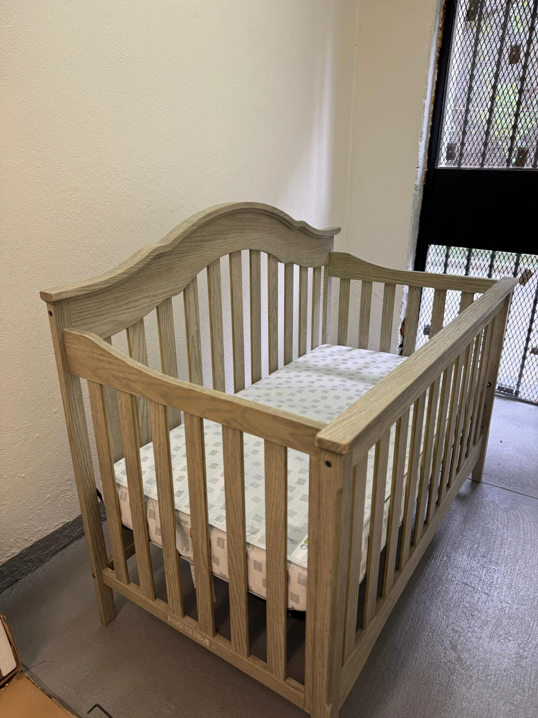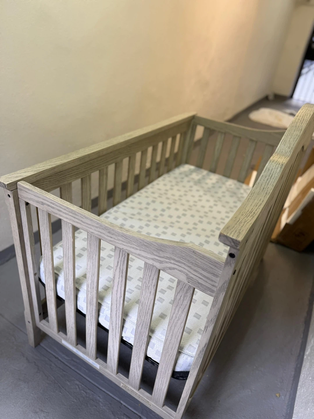 Here's a hermosa crib It's in great shape and ready for a new home. The color is a textured limestone. Includes a stain-free mattress in perfect condition, barely used.