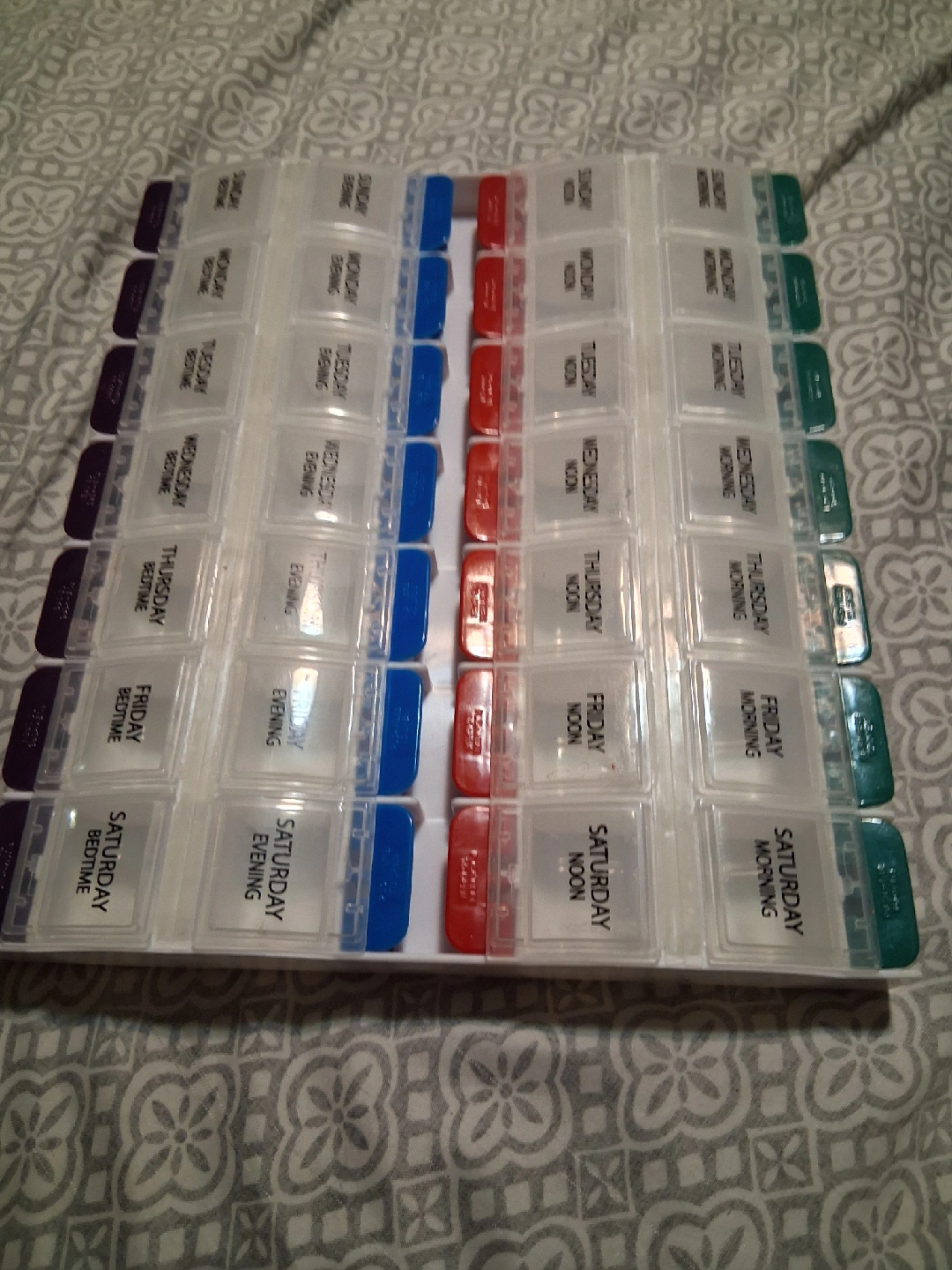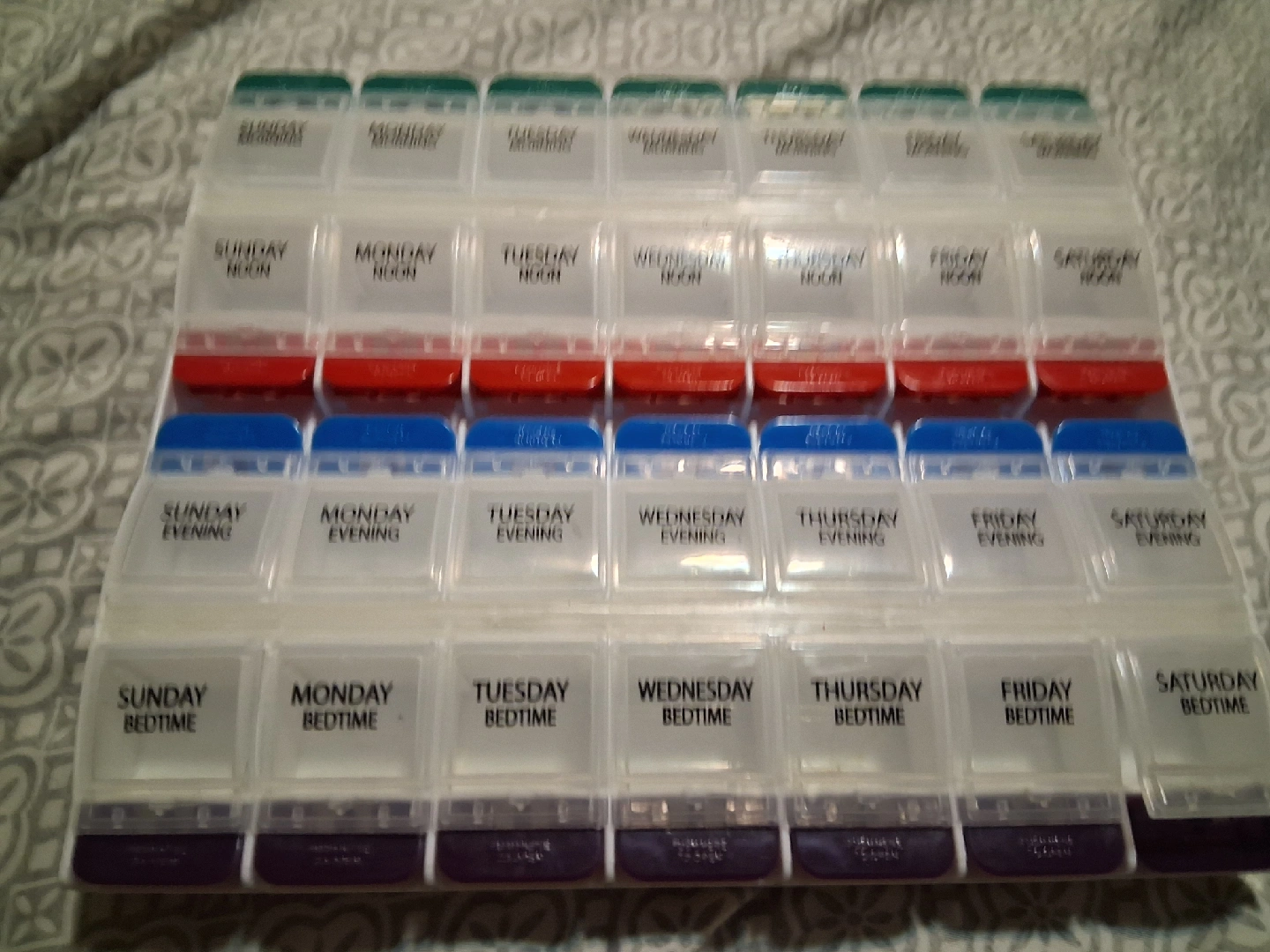 I'm selling a weekly pill organizer! It has separate compartments for morning, noon, evening, and bedtime for each day of the week 28 day new Perfect for keeping your medications organized