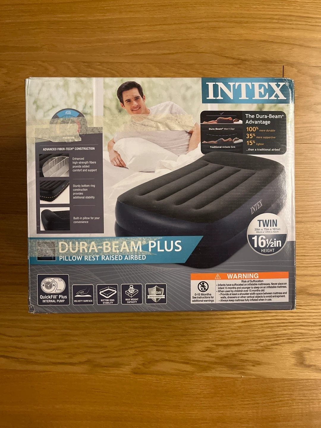 15Selling a brand new Intex Dura-Beam Plus Pillow Rest Raised Airbed in Twin size! It's still in the box and has never been used. Key features include: - Advanced Fiber-Tech construction for enhanced comfort and support - Built-in pillow - QuickFill Plus internal pump - Velvety surface - Bottom ring stability - Max weight capacity Dimensions: 39in x 75in x 16½in (99cm x 1.91m x 42cm)