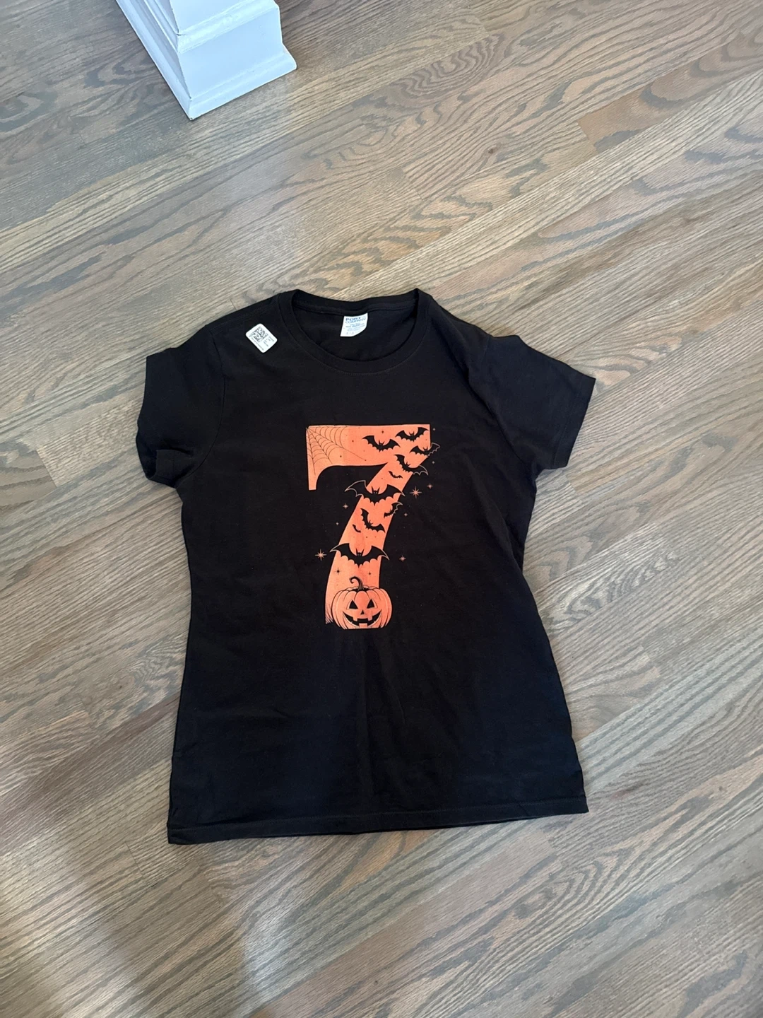 18Here's a black t-shirt with a Halloween-themed design! It features a large number 7 with a spiderweb, bats, and a pumpkin. Great for Halloween!