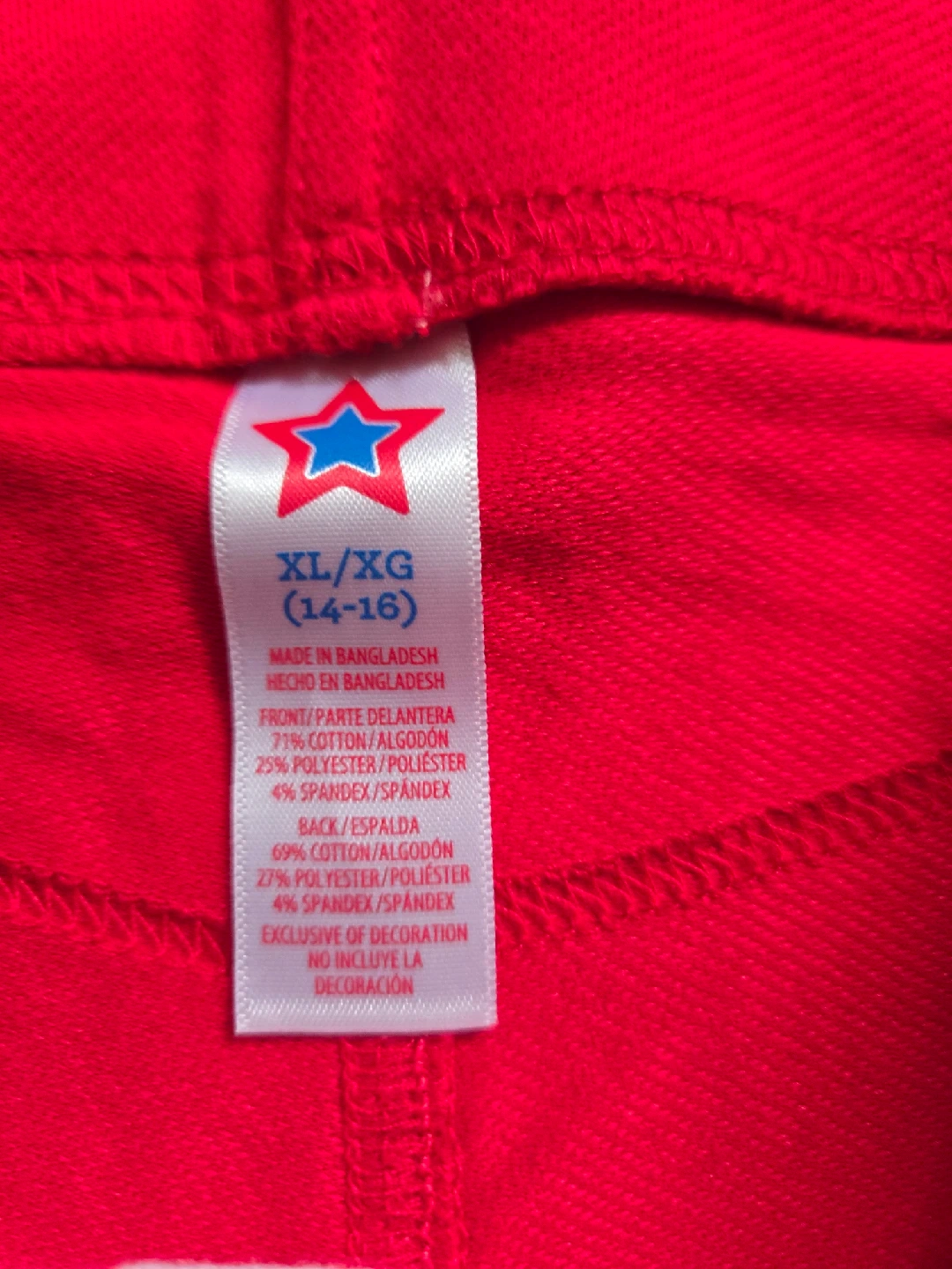 129Cute Wonder Nation shorts, size XL (14-16). They feature a patriotic design with stars and stripes. Made of 71% cotton, 25% polyester, and 4% spandex for a comfy fit