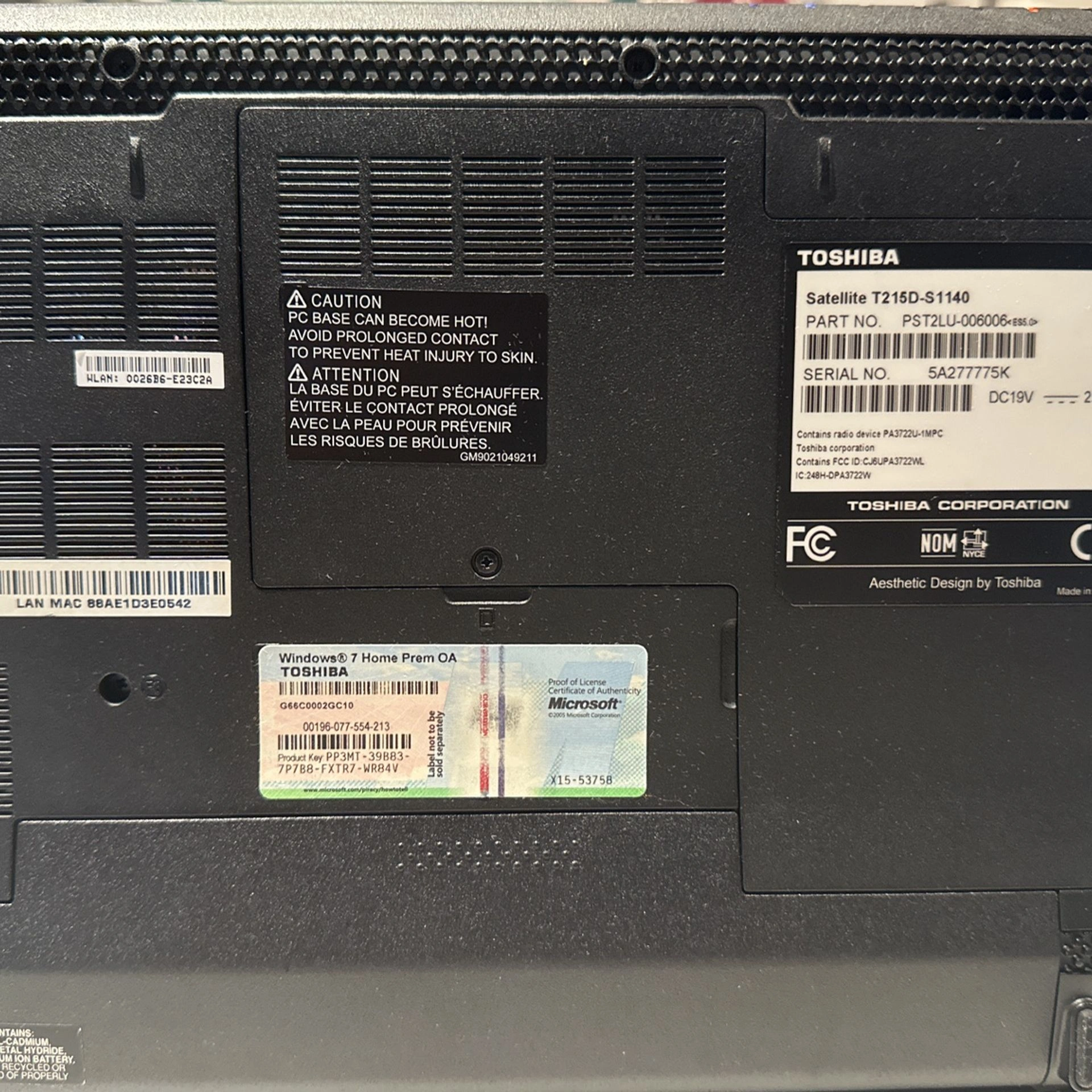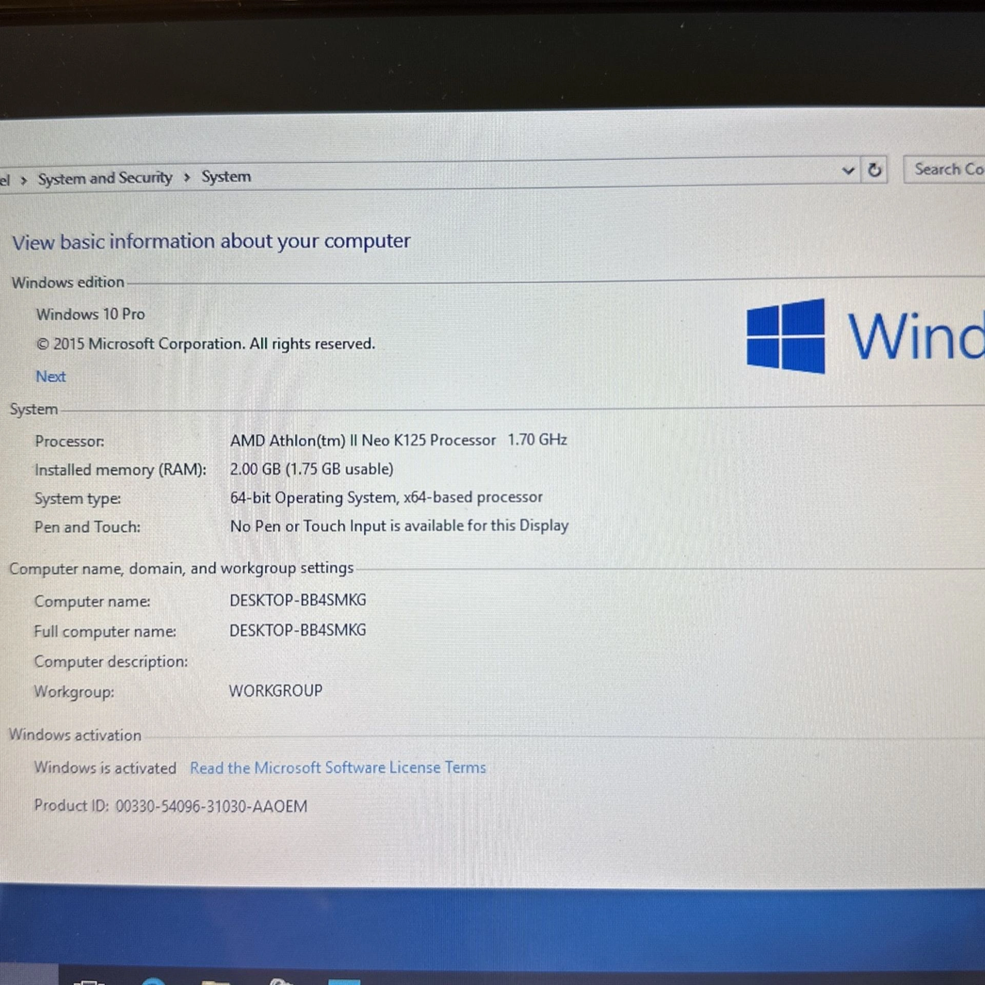 93Windows 10 Pro AMD Athlon Neo K125 Processor 2.00 GB 64-bit Operating system, x64-based processor. (Note: battery needs to be replaced) Model: Satellite T215D-S1140 Brand: Toshiba