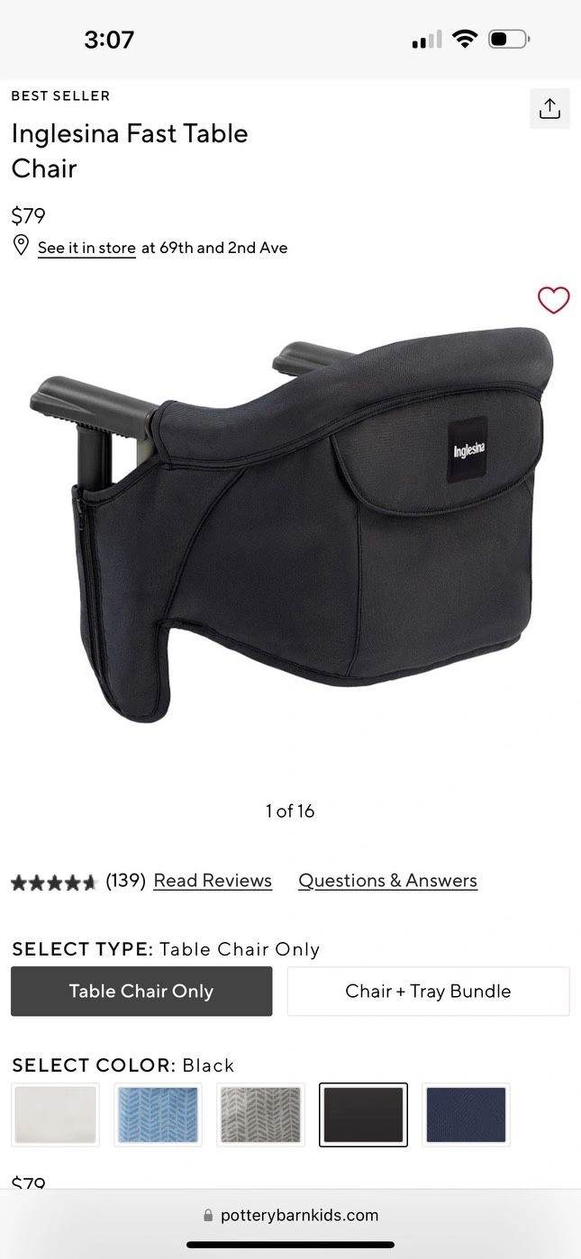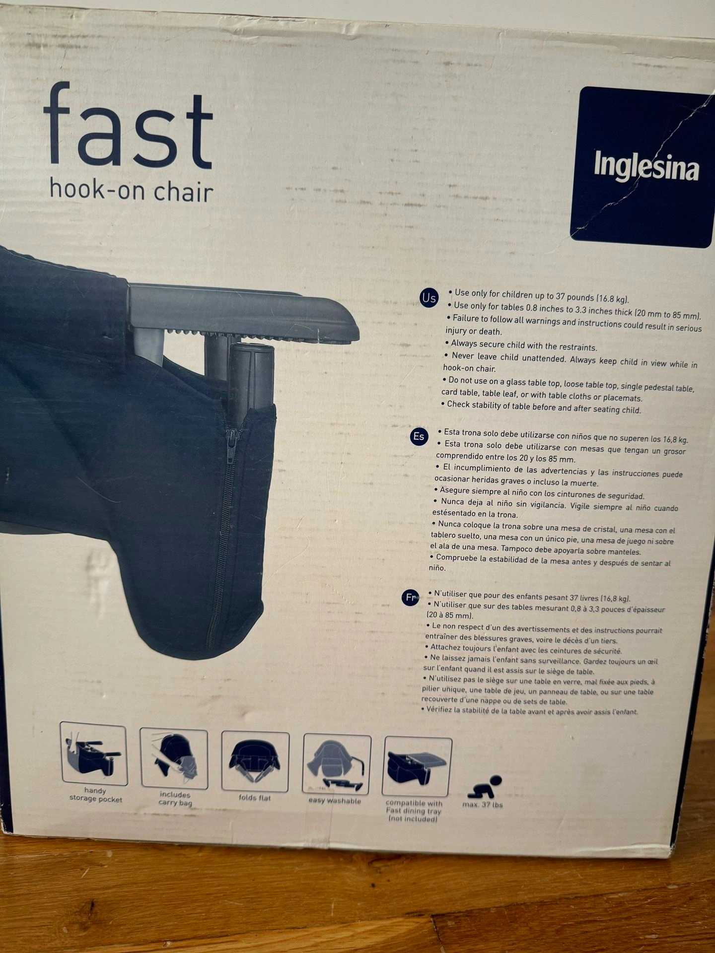 73Baby table chair Inglesina- fast hook on chair. Brand New! Unopened bag, original box has some scuff as pictured but content is unopened. Color: Black Brand: Inglesina
