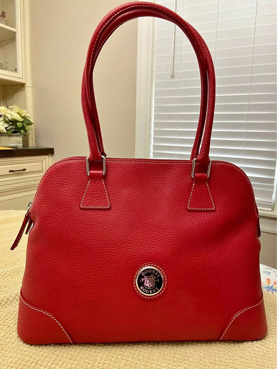 65Vintage Dooney & Bourke Red Pebble Leather Domed Satchel/Purse. Circa 2007, Vintage. *Authentic, New, Never Used, in Excellent Condition. Serial # and model/style # in photos. Original price $298. 100% genuine pebble grain leather. Cotton/poly canvas lining. Pristine silver hardware throughout, with silver D&B emblem on front of bag, and six silver feet on the bottom. Top zipper closure, works perfectly. Has internal zippered pocket 7” in length, with another small internal pocket. Has inside key clasp attached with leather strap, a D&B leather key fob, and a small zip pouch with wristlet strap…all connected with original plastic fastener. Exterior back of purse has a zippered pocket 7” in length. Purse is extremely clean, dust-free…has been carefully packed away for years. One owner, my MIL. No scratches, rips or stains. Comes in original clear plastic bag. •14” long, 10” high, 5.5” deep. •Handle drop 9”. •Includes purse, key fob, small wristlet Cash only. Meet in Garfield Ridge, Chicago, near Midway. Willing to meet near Oak Lawn, EP, Alsip, Orland, Palos, Countryside, LaGrange, Burr Ridge, Hinsdale, Darien ☺️
