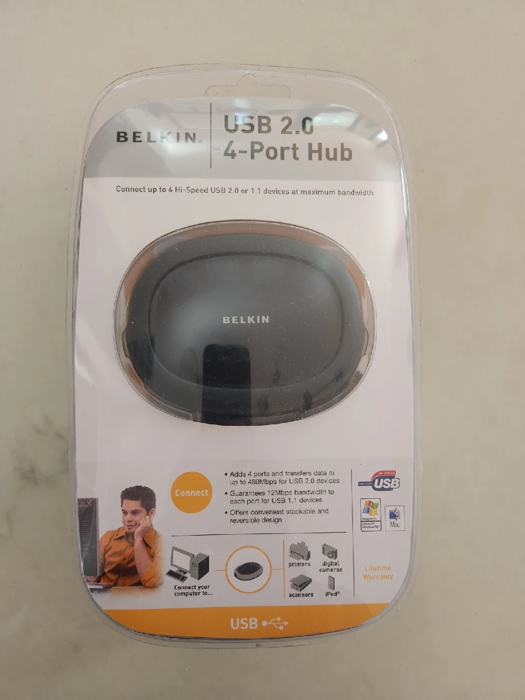 I'm selling a brand new Belkin USB 2.0 4-Port Hub, still in its original packaging! It connects up to 4 Hi-Speed USB 2.0 or 1.1 devices. It adds 4 ports and transfers data at up to 480Mbps for USB 2.0 devices. It also guarantees 12Mbps bandwidth to each port for USB 1.1 devices. It offers a convenient stackable and reversible design