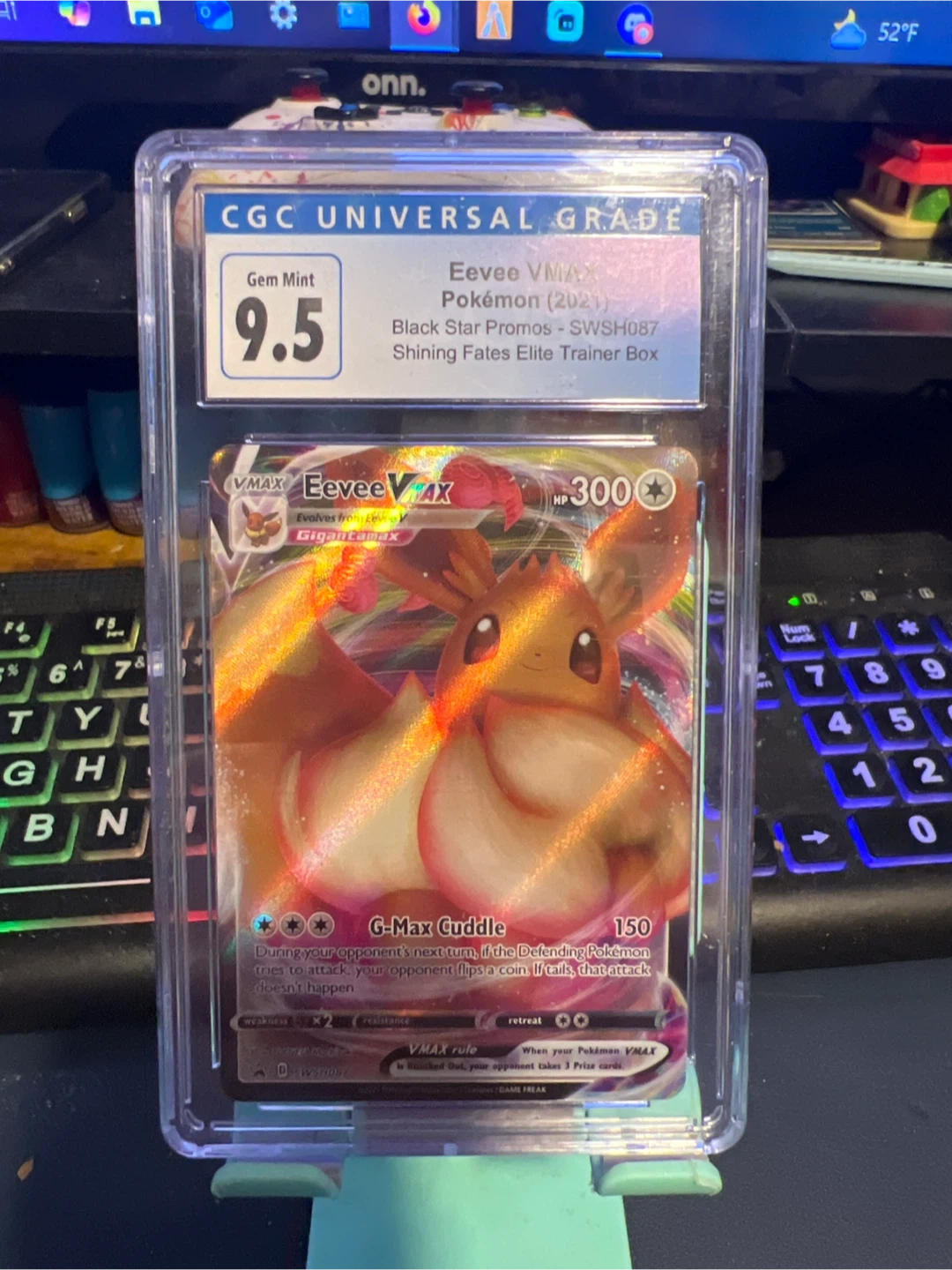 75Selling a graded Eevee VMAX Pokemon card. It's a CGC Universal Grade Gem Mint 9.5. This card is from the Black Star Promos - SWSH087 Shining Fates Elite Trainer Box series. Great condition!