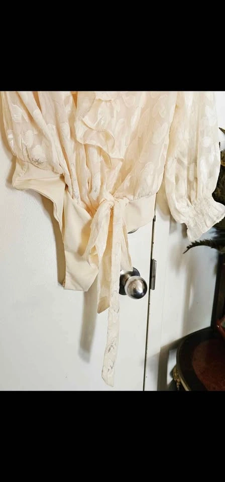 This elegant Persephone cream bodysuit from ASTR The Label features flowing ruffles around a plunging V neckline, and a flattering wrap design. Made with a semi-sheer damask style monochromatic floral fabric that has a bit of shine to it. Sleeves are unlined and semi-sheer, and the torso is lined with a cream lining. It has romantic peasant style long sleeves with ruching at the wrists, and ties with a bow at the hip. Wrap is also secured with a hidden hook and eye closure at the chest. Easy to dress up with a formal skirt or pants, or dress down with some jeans.