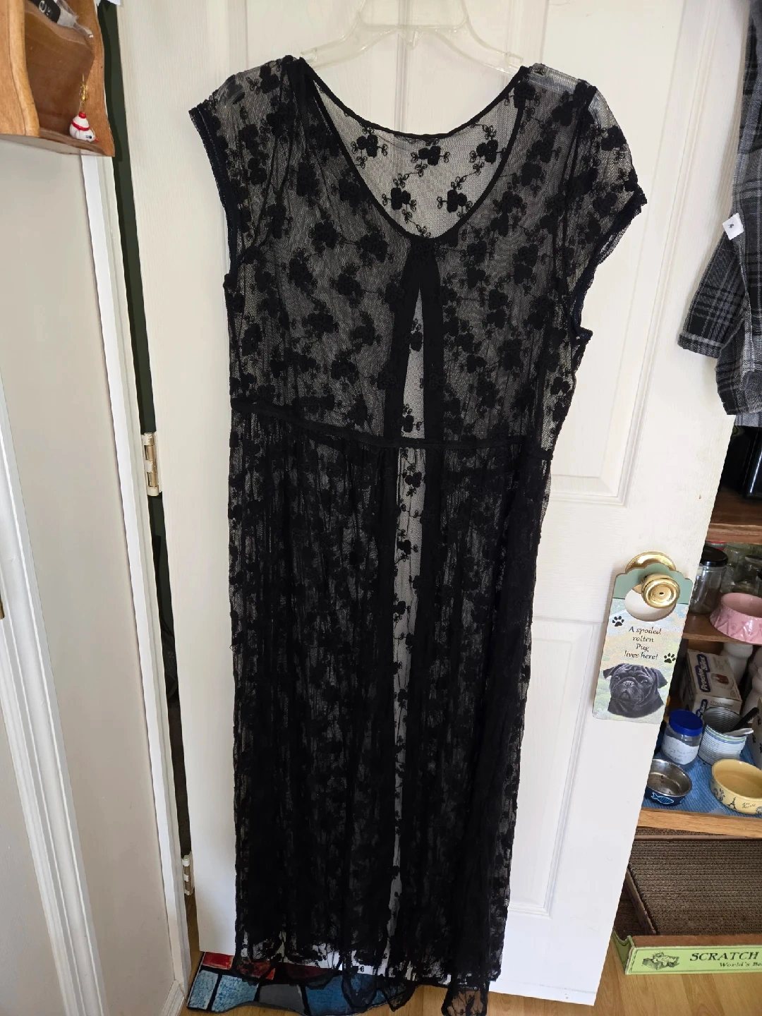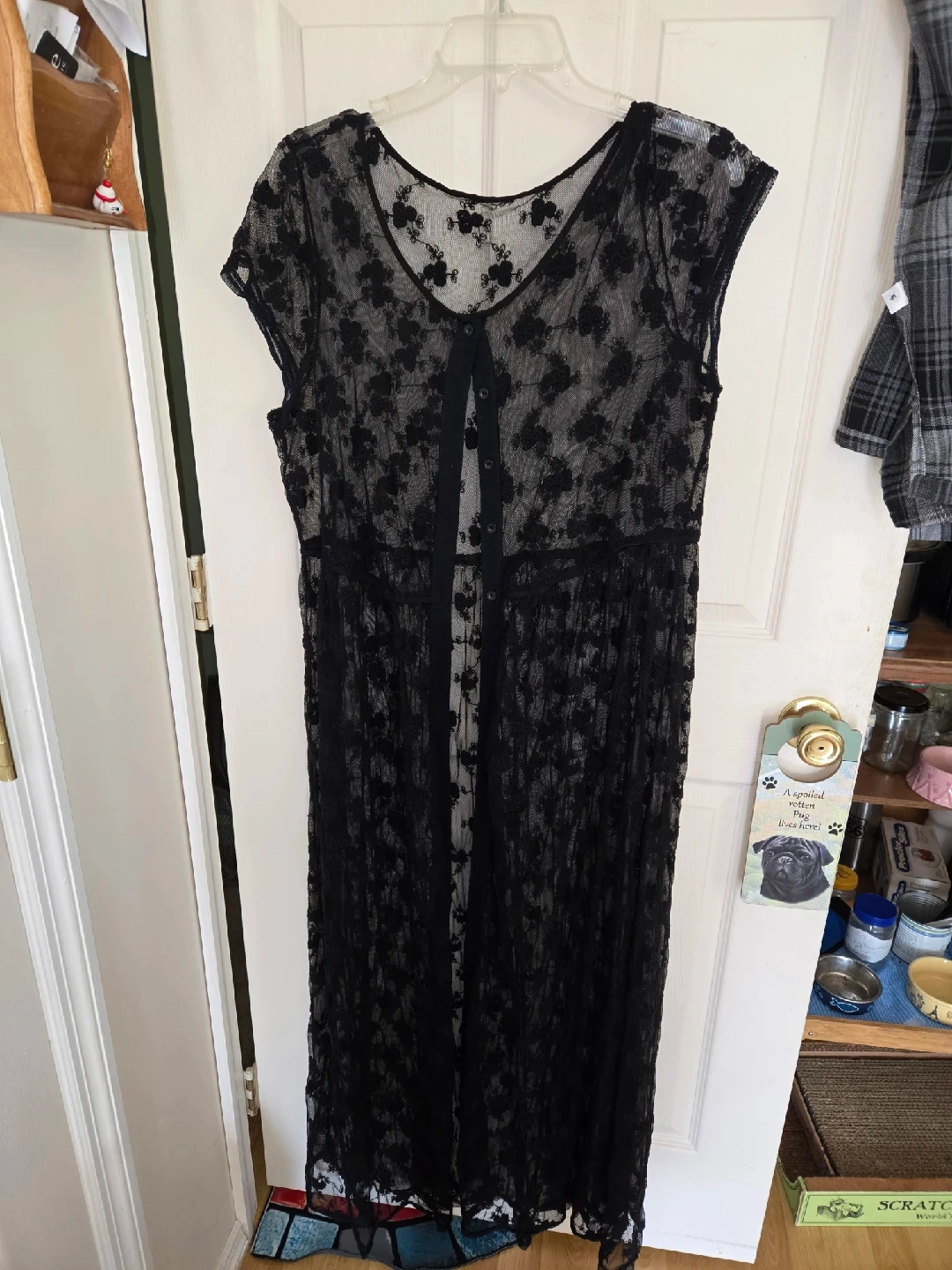 25This is a beautiful black lace over throw. It has a V-neck and a button-up front. This over throw is in great condition and ready for a new home! Pick up in the Town of Newburgh NY by Aldi's