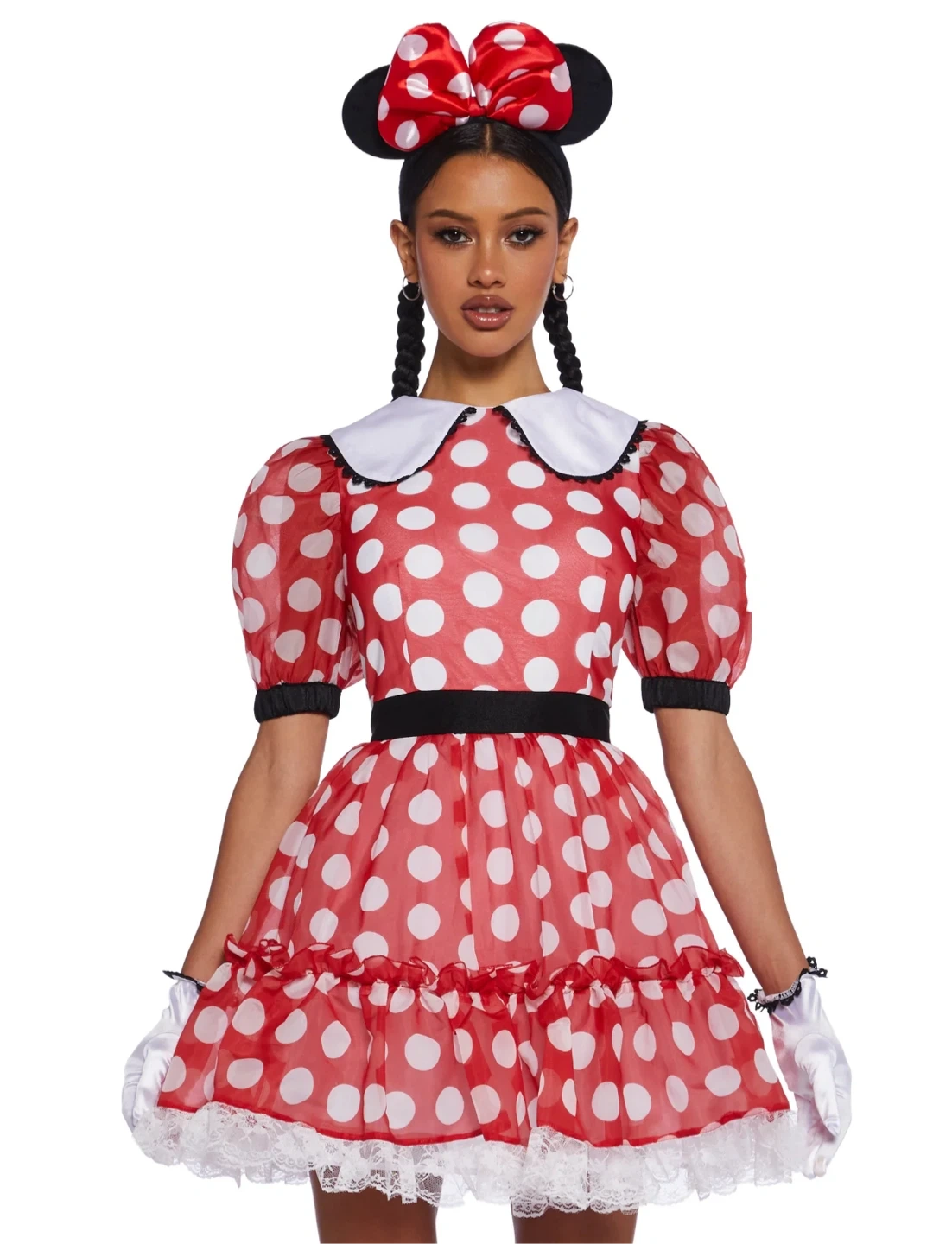 50Get ready to dress up with this adorable Minnie Mouse costume! It features a red and white polka dot dress with a white collar and a matching headband with Minnie's signature ears and bow. Perfect for Halloween or any dress-up occasion!