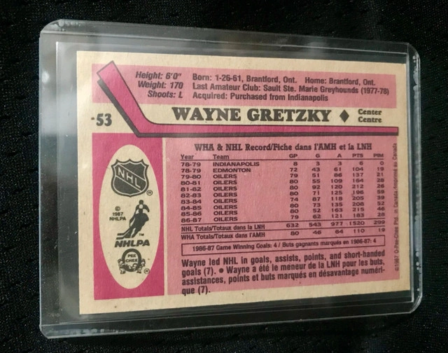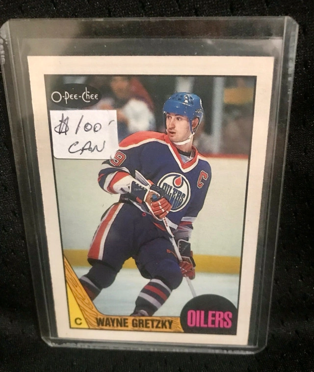 This is a Wayne Gretzky 1987 O-Pee-Chee #53 hockey card, featuring the Hall of Famer in his Edmonton Oilers uniform. The card is in great condition, as you can see from the photos. A fantastic piece of hockey memorabilia for any Oilers or Gretzky fan! * Player: Wayne Gretzky * Team: Edmonton Oilers * Card Number: #53 * Year: 1987 * Brand: O-Pee-Chee If you're reading this, the card is still available, so don't hesitate to reach out!