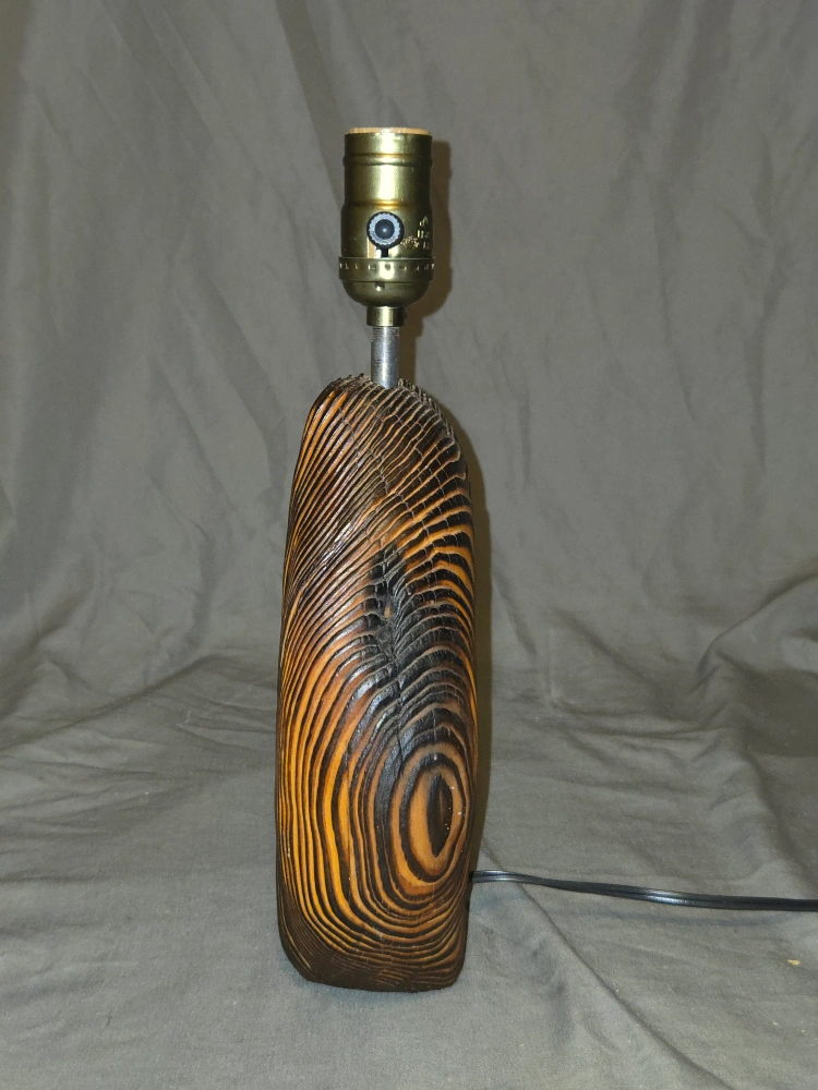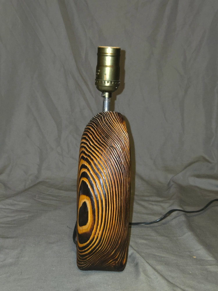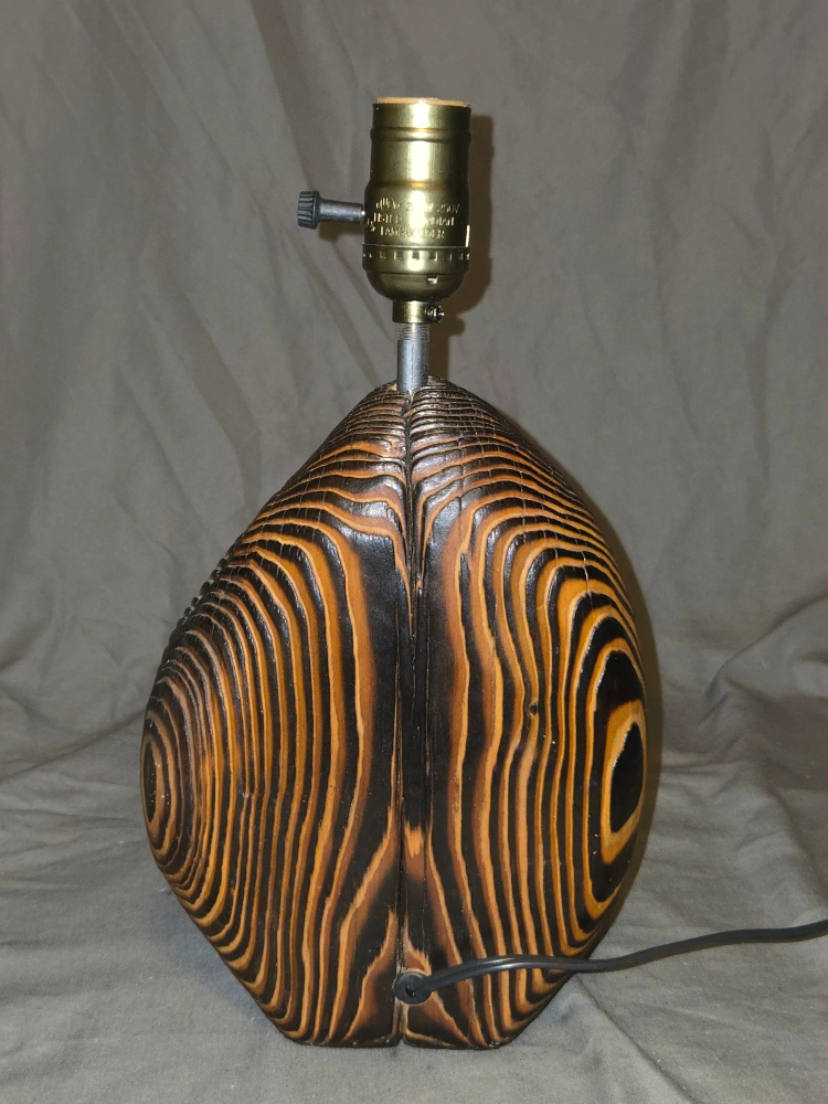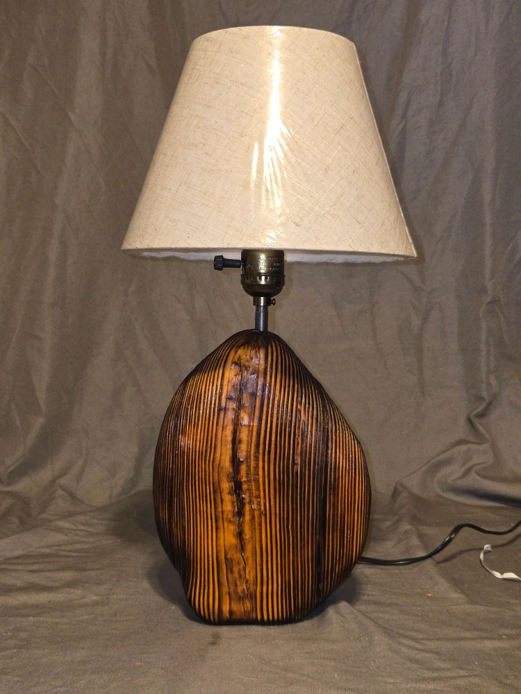 This is a unique table lamp with a wood grain base and a beige lampshade. It would make a great addition to any room!