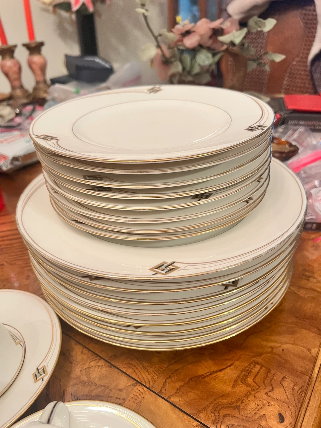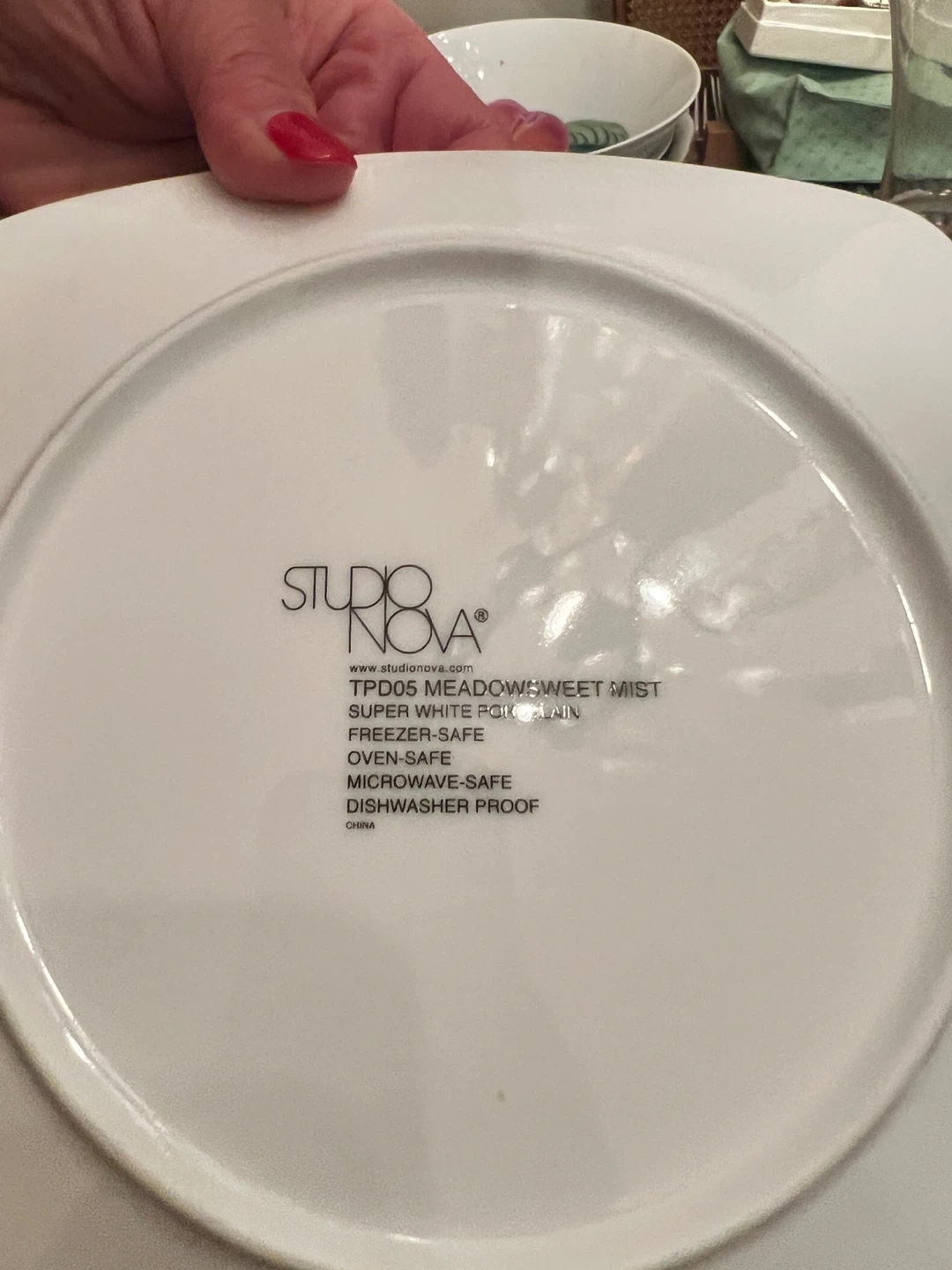 42Studio Nova Meadow Sweet Mist plate. It's super white porcelain, oven-safe, freezer-safe, microwave-safe, and dishwasher proof