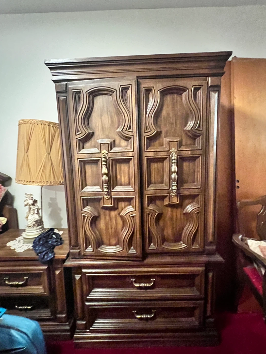 43Selling a vintage dark wood armoire. It's a beautiful piece of furniture with ornate detailing on the doors and drawers. It would be a great addition to any bedroom or living room for extra storage!