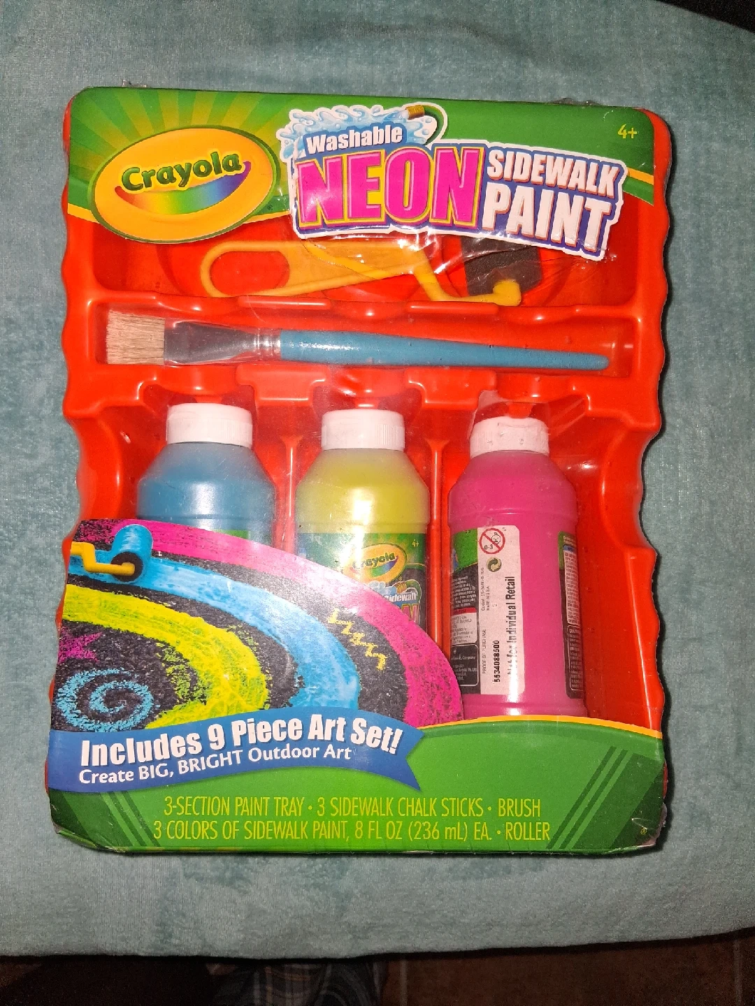 Get ready to create big, bright outdoor art with this Crayola Washable Neon Sidewalk Paint set! This 9-piece art set includes a 3-section paint tray, 3 sidewalk chalk sticks, a brush, and 3 vibrant colors of sidewalk paint (8 fl oz each). It also comes with a roller!