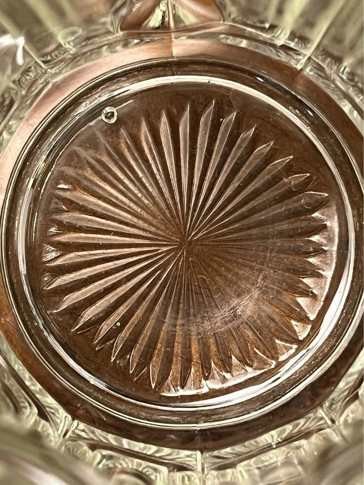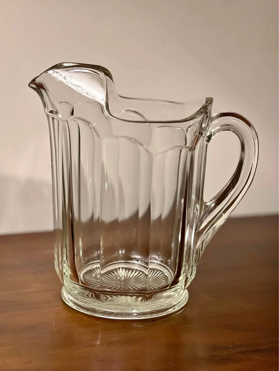 98This is a vintage clear glass pitcher with paneled sides and a starburst pattern on the bottom. The style is often associated with pressed glass from the Mid-Century Modern era or earlier. Key characteristics of this type of pitcher include: Design: A paneled pattern on the sides and a starburst design on the base. Material: It is made from heavy, clear, pressed glass. Potential Manufacturers: While many such pitchers are unmarked, some may be attributed to companies like Hazel-Atlas or Anchor Hocking, which were known for producing this type of glassware. Used. Sold “As Is”. There are a couple of imperfections as shown in the photos. Weight: 3.7 lbs Height: 8” 8” spout to handle Base 4.5”