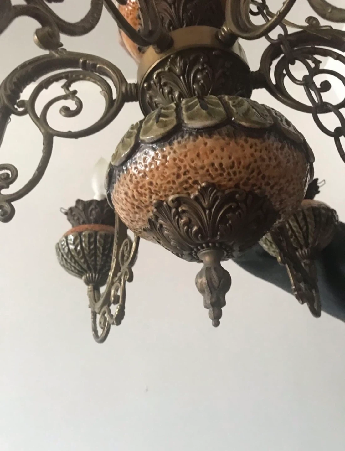 23Unique vintage chandelier with ceramic and metal details Features a distinctive tiered design with textured ceramic elements in earthy tones Six arms extend outward, each holding a lightbulb (bulbs included) Adds a touch of retro charm to any room