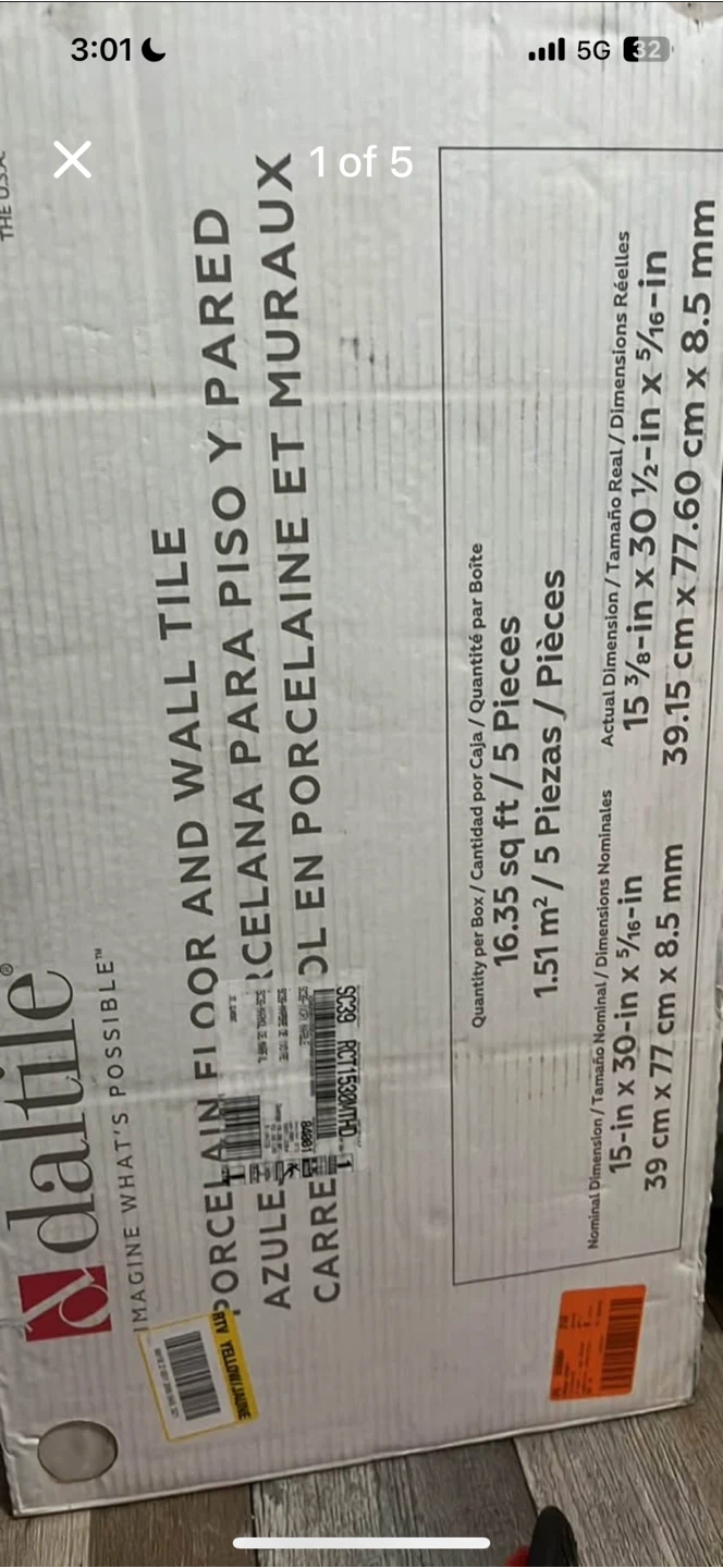 60Selling a box of Daltile porcelain floor and wall tiles. Each tile measures approximately 15 inches by 30 inches with a thickness of 5/16 inch. There are 5 pieces in the box, covering 16.35 square feet or 1.51 square meters.